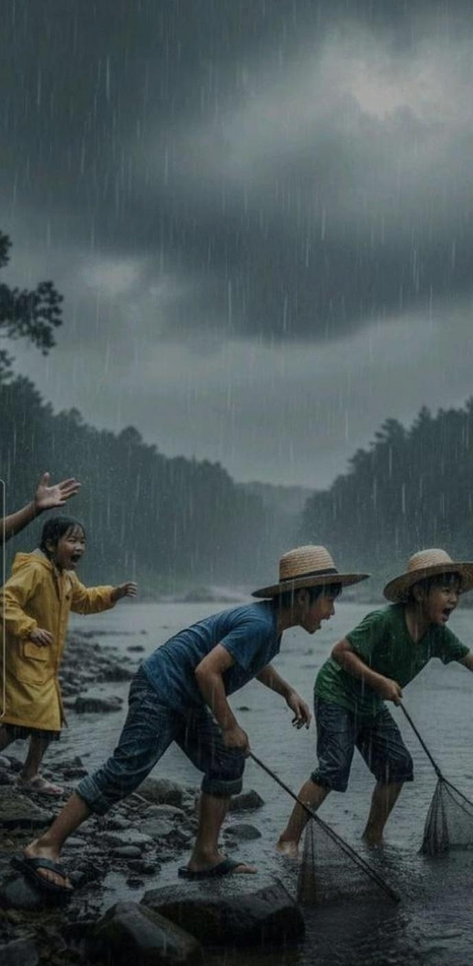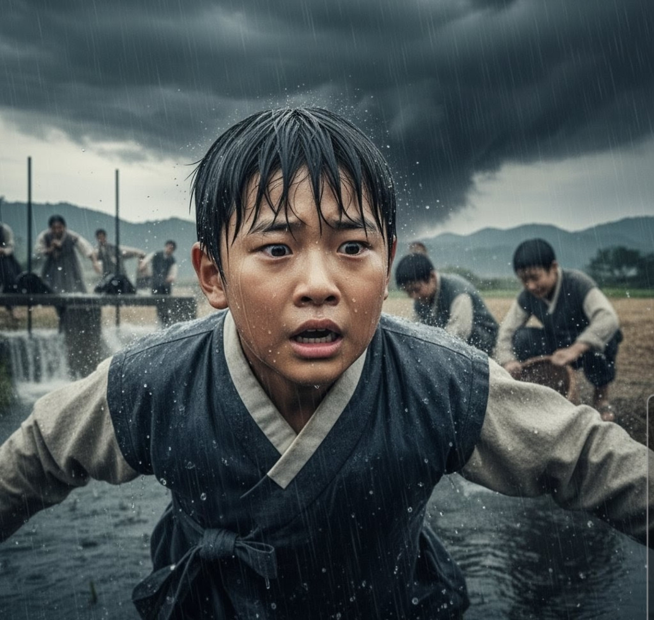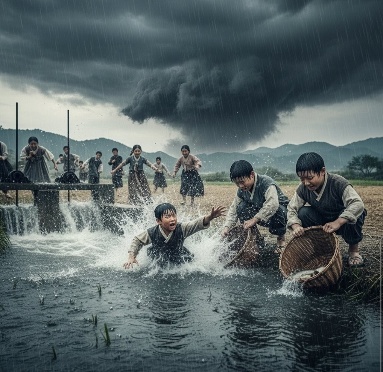 "어서 피하자!" 정치가 외쳤다.그런데 문제는 그때부터 시작되었다. 갑작스런 폭우로 저수지 위쪽에서 내려온 빗물이 수문으로 쏟아져 들어오면서, 수문 아래의 물이 급격히 불어나기 시작한 것이다."야, 물이 갑자기 많아진다!" 다른 아이들이 소리치며 물가에서 급히 뛰쳐나왔다.산갑이와 정치도 서둘러 나오려 했지만, 이미 물살이 너무 거세졌다. 산갑이가 물에서 나오려고 발을 디디는 순간, 미끄러운 돌에 발이 헛디뎌 물 속으로 풍덩 빠져버렸다."으앗!"