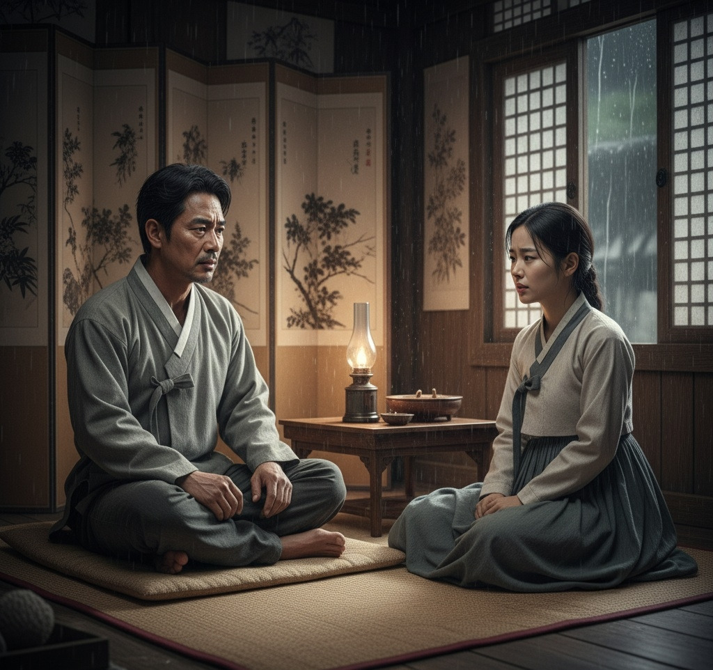 창밖에서는 빗소리가 그치고, 맑은 달빛이 방 안을 비추기 시작했다.