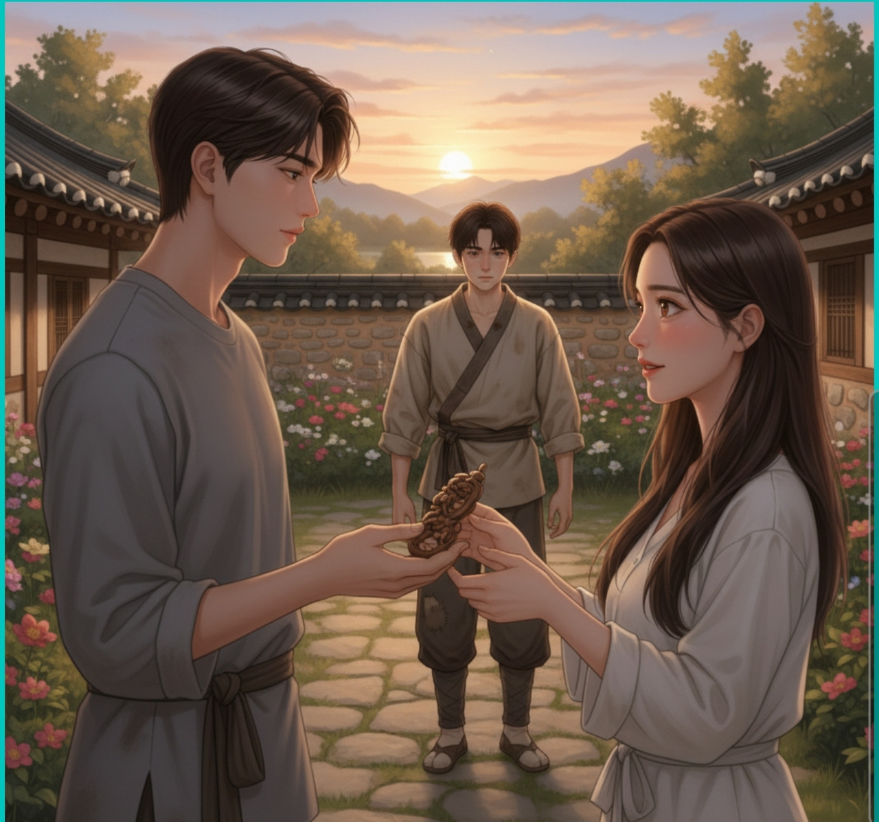 "고마워요. 정성이 느껴져요." 서영이 부드럽게 말하며 장신구를 받았다.정치의 얼굴에 환한 미소가 피어올랐다. 하지만 그 순간 산갑이가 나타났다."서영 양, 여기 계셨군요." 산갑이가 다가오며 정치를 발견했다.