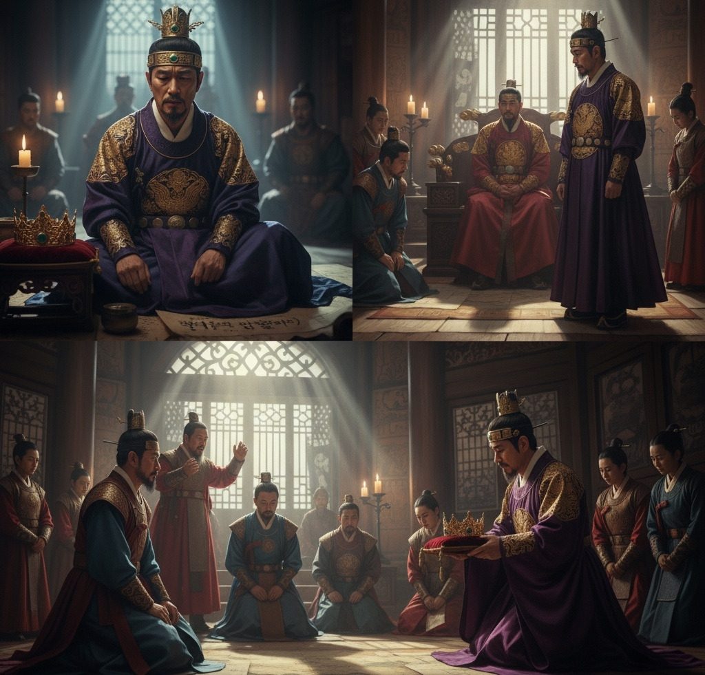 신라군의 압박 속에서 금관가야의 마지막 왕 구해왕이 깊은 고민에 빠져 있는 모습입니다. )