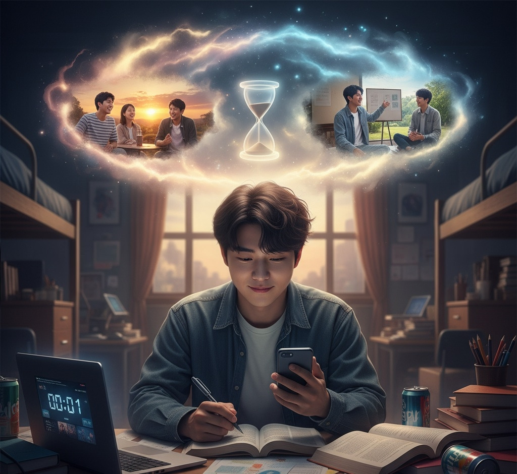 대학생인 민수는 과제가 산더미처럼 쌓여 있지만, 친구들과의 약속과 좋아하는 드라마 시청을 포기하지 못합니다. "아직 시간이 많으니까 괜찮아. 내일 하면 되지 뭐."라고 생각하며 밤늦게까지 놀다가 결국 과제를 마감 직전에 허둥지둥 끝내곤 합니다. 시험 기간에도 마찬가지입니다. 벼락치기로 밤을 새우는 일이 다반사입니다. 민수는 아직 젊고, 앞으로도 수많은 날들이 자신을 기다리고 있다고 막연히 생각하며 현재의 시간을 소중히 여기지 못합니다.