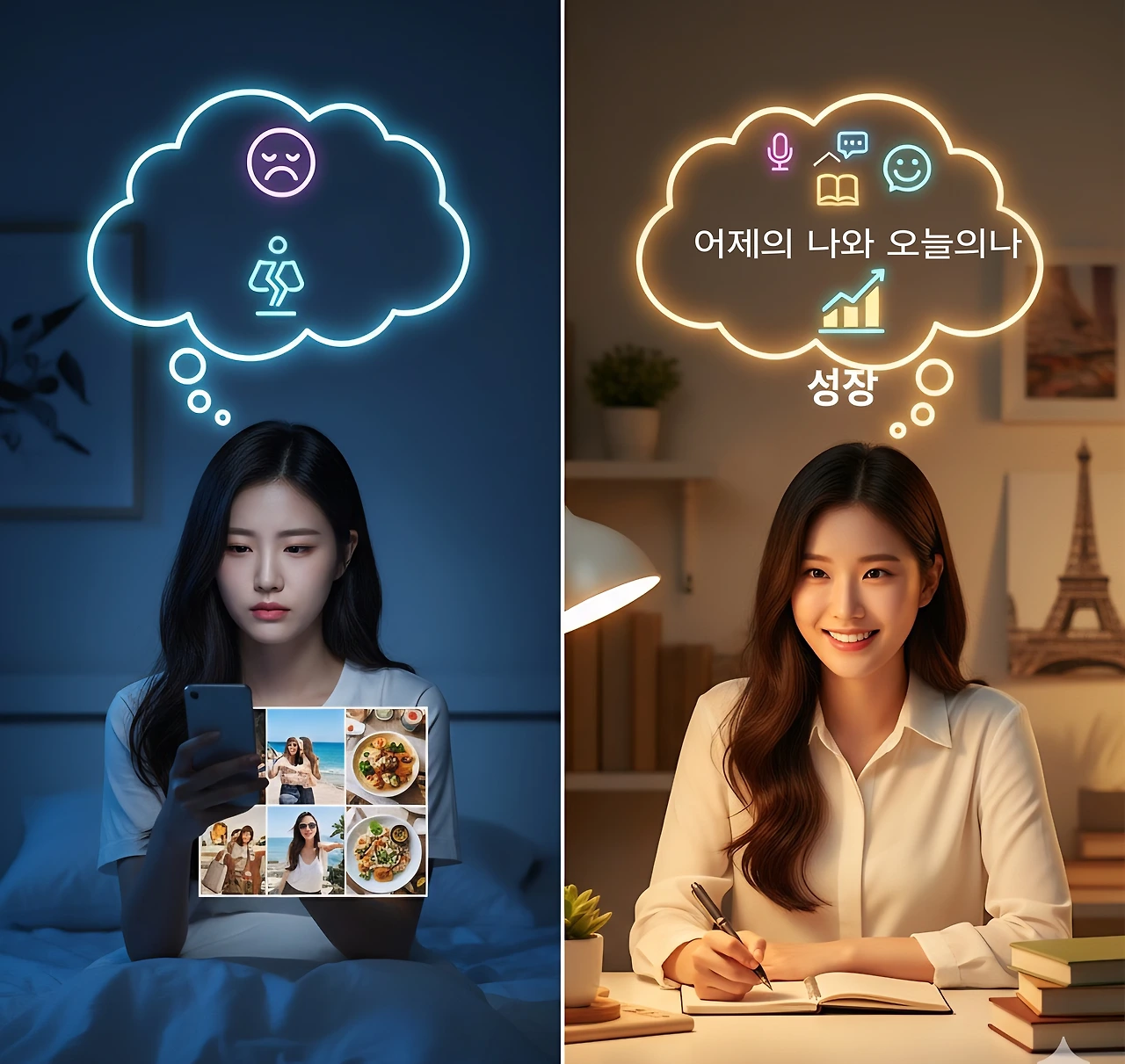 이렇게 '어제의 나'와 '오늘의 나'를 비교하면서 수진 씨는 점차 긍정적인 변화를 느끼기 시작했습니다. 남들의 화려한 삶에 일희일비하기보다는, 자신의 성장과 발전에 집중하게 되었습니다. 매일 조금씩 나아지는 자신을 발견하면서 자존감도 회복되었고, 이전에는 보이지 않던 자신의 장점과 매력도 깨닫게 되었습니다. 이제 수진 씨는 더 이상 SNS 속 허상에 흔들리지 않고, 오롯이 자신만의 속도로 성장하며 행복을 찾아가고 있습니다.