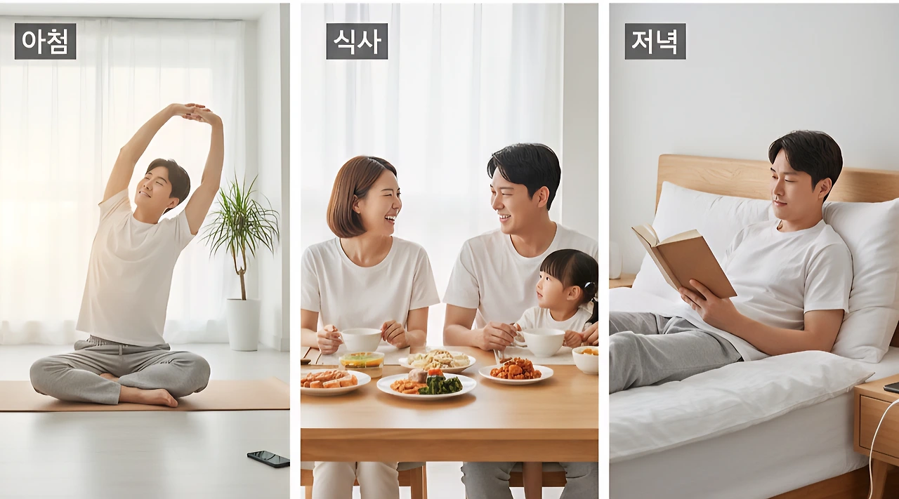 아침 기상 후 1시간 폰 금지: 알람을 끄고 폰을 바로 확인하는 대신, 스트레칭을 하거나 아침 식사를 준비하며 하루를 차분하게 시작했습니다.