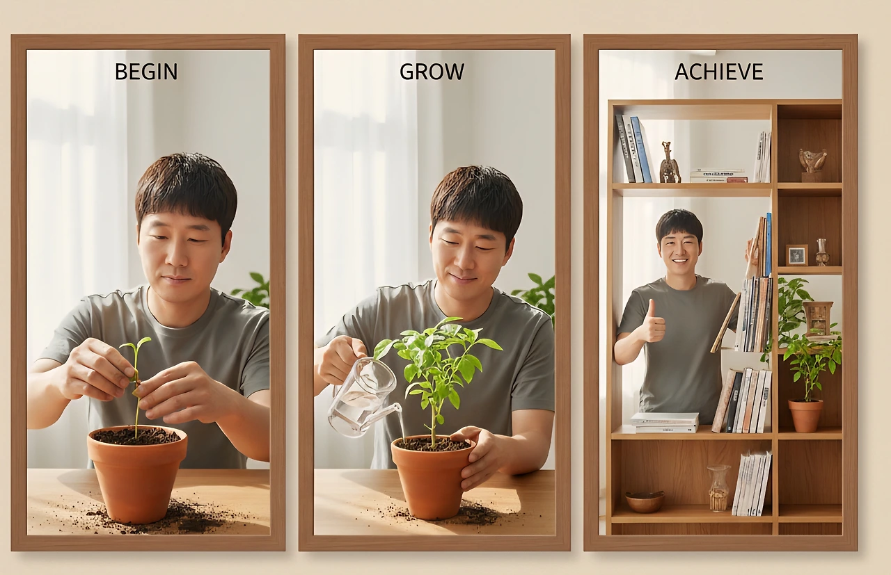 예를 들어, 헬스장에 갈 여건이 안 되면 집에서 맨몸 운동 10분이라도 하고, 거창한 사업 계획 대신 작은 아이디어라도 일단 실행에 옮겨보는 것이죠.