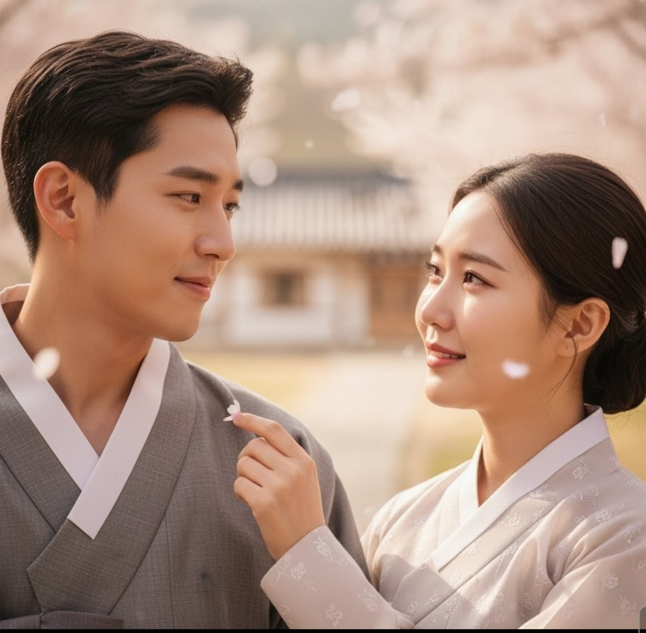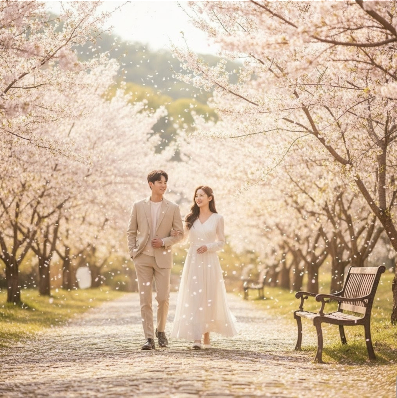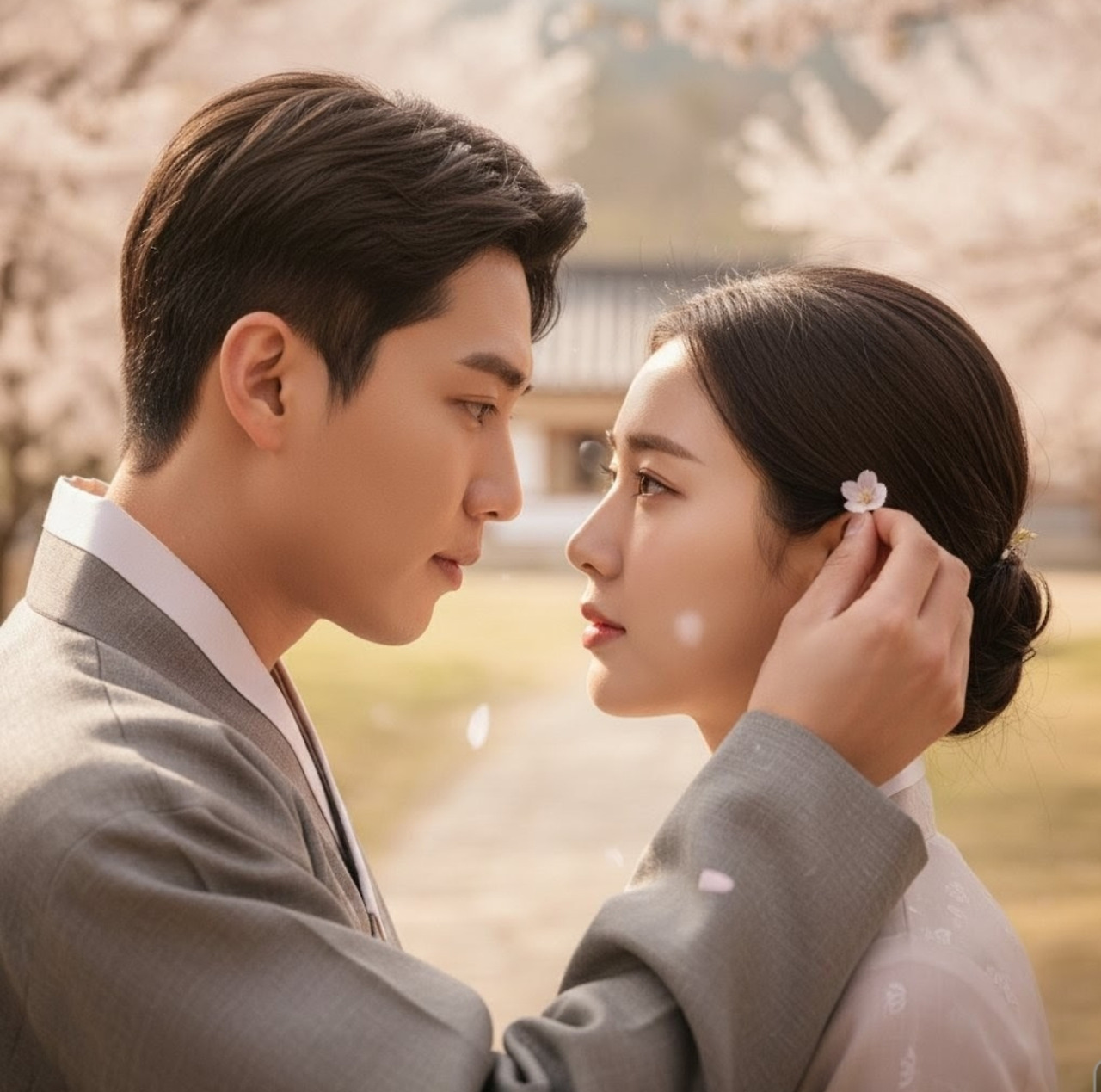 벚꽃잎이 환상처럼 흩날리는 가운데, 오랫동안 기다려온 사랑을 확인하는 순간이었다.