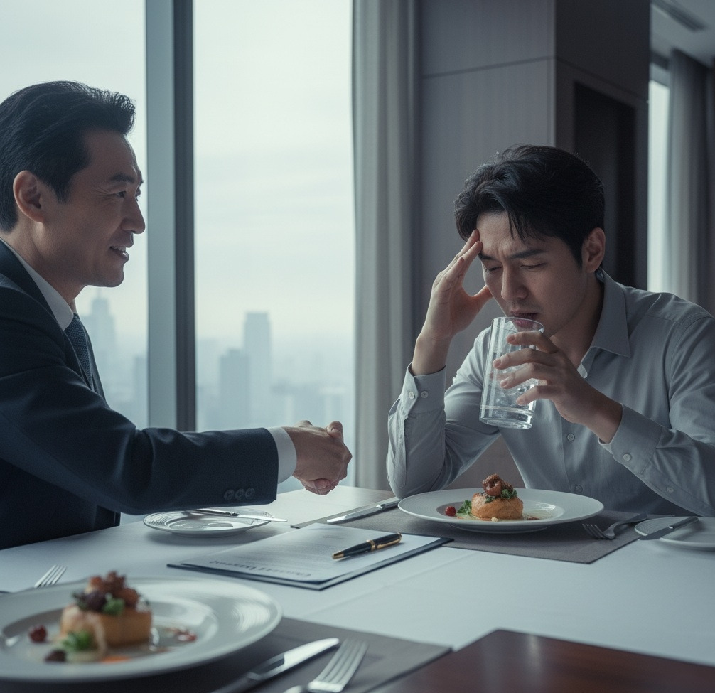 ​점심시간, 고급 레스토랑에서 중요한 계약을 성사시킨 민준은 왠지 모를 피로감에 시달렸다. 머리가 지끈거리고 집중하기 어려웠다. 시원한 물 한 잔을 단숨에 들이켰지만, 이미 몸은 탈수 상태에 접어들고 있었다. 그는 자신의 몸이 보내는 작은 신호들을 애써 무시하며 다시 일에 몰두했다.