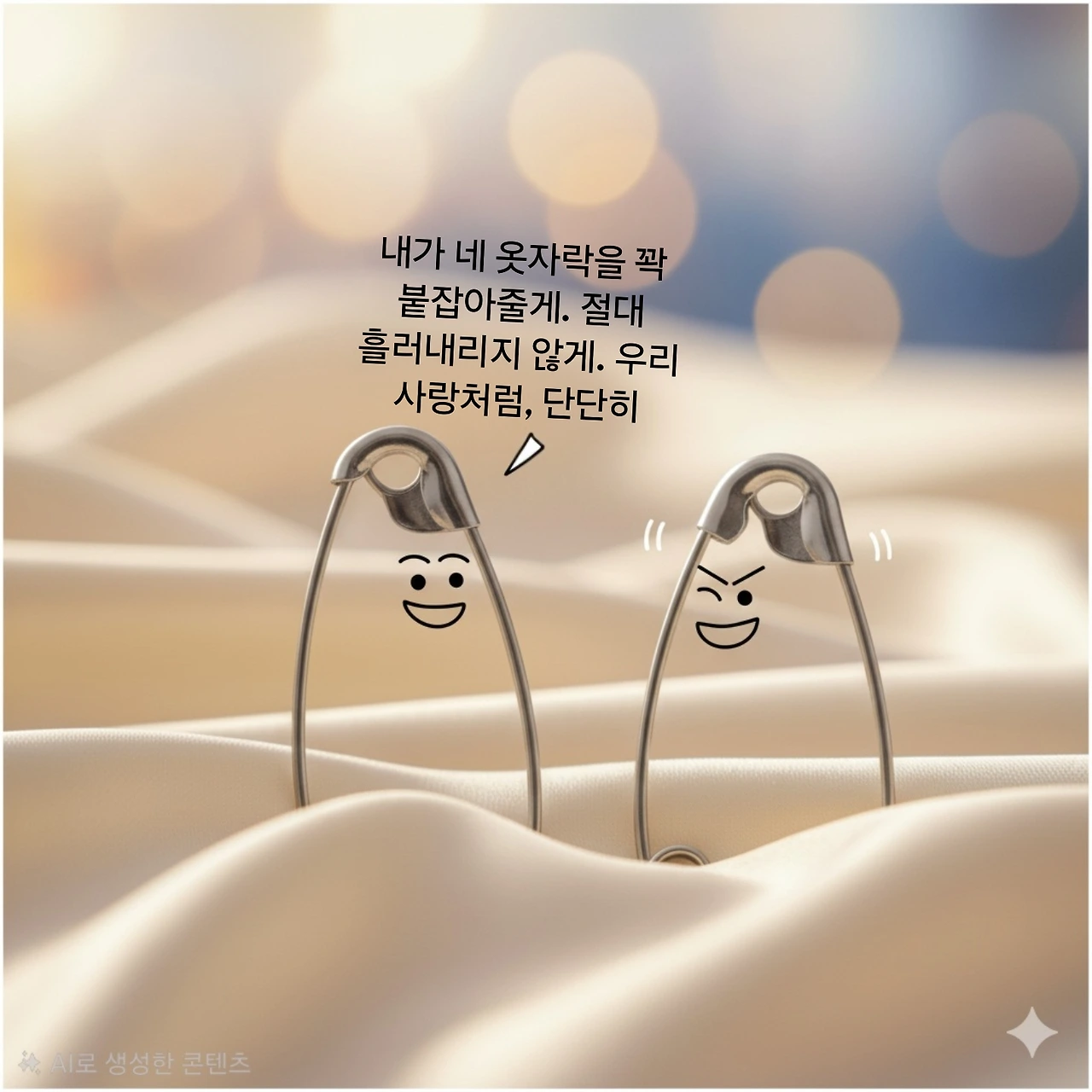 (흥분된 목소리로) 오호, 도전이네! 내가 네 옷자락을 꽉 붙잡아줄게. 절대 흘러내리지 않게. 우리 사랑처럼, 단단히.