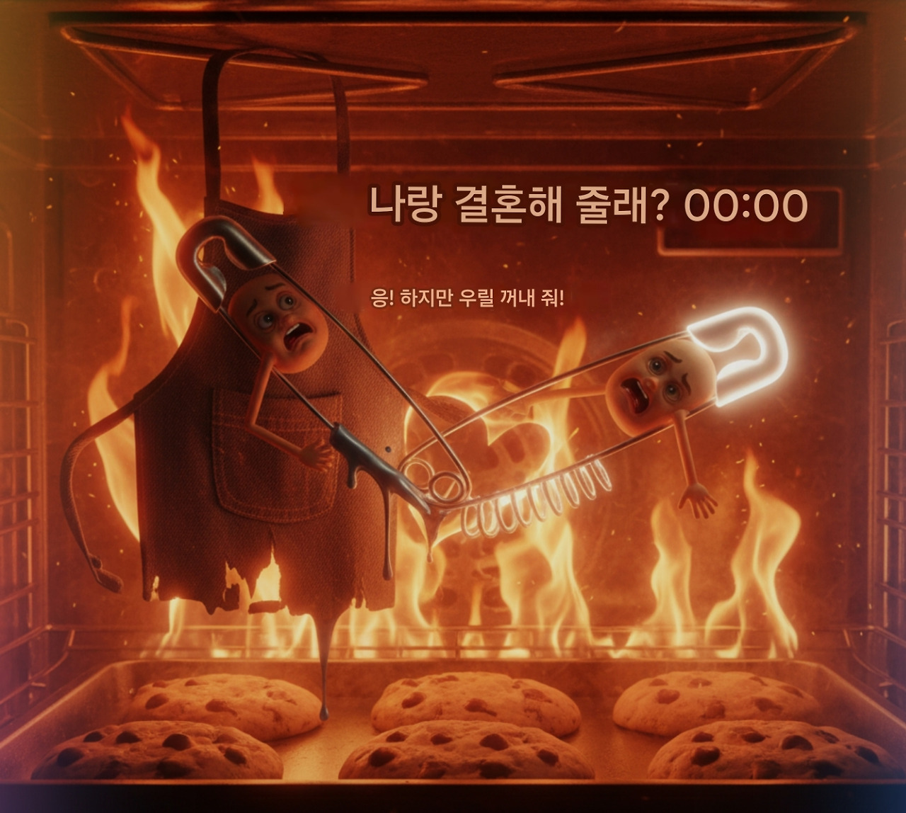 장면: 건조기 로맨스에서 겨우 살아남은 다음 주말. 주인이 주방에서 쿠키를 굽기로 결심한다. 오븐 문이 열리고, 뜨거운 열기가 솟구친다. 옷핀 A와 B는 이번엔 주인의 앞치마 주머니에 숨어 있다 – 왜냐하면 B가 "이번 데이트는 특별하게!"라고 주장했기 때문이다. 오븐 선반에 앞치마가 걸치고, 문이 쾅 닫힌다. 불꽃이 피어오르고, 온도가 200도까지 치솟는다. 세상이 붉게 물들며, '딸깍딸깍' 소리가 울린다. 이건 더 이상 모험이 아니라, 생사의 위기다.