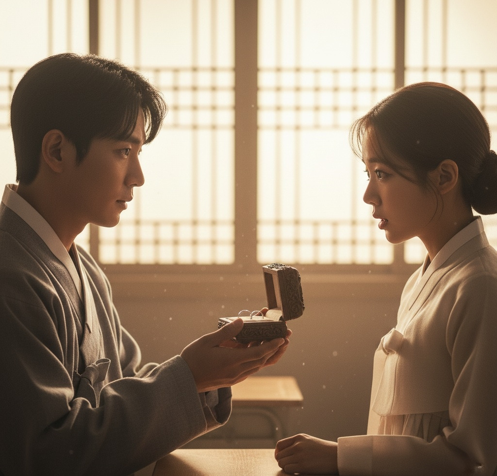 "서영 양." 산갑이 불렀다. 서영이 돌아보자, 산갑은 작은 상자를 꺼냈다. 그 안에는 소박하지만 정성스럽게 준비한 은반지가 들어있었다.