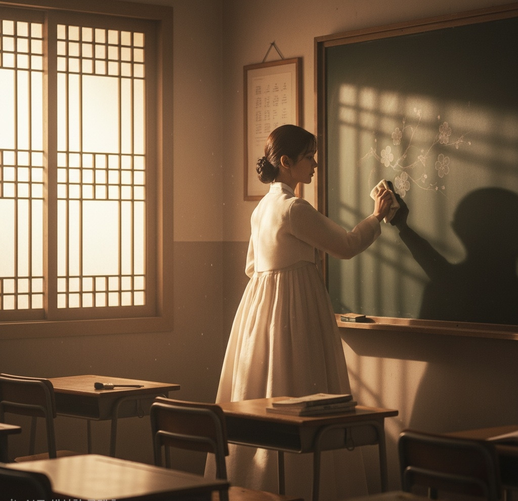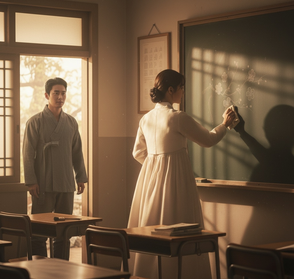 서영은 아이들이 쓰던 칠판을 닦고 있었고, 산갑은 그런 그녀를 바라보며 가슴이 벅찼다.
