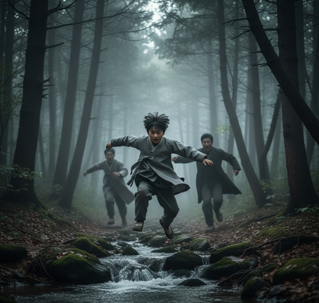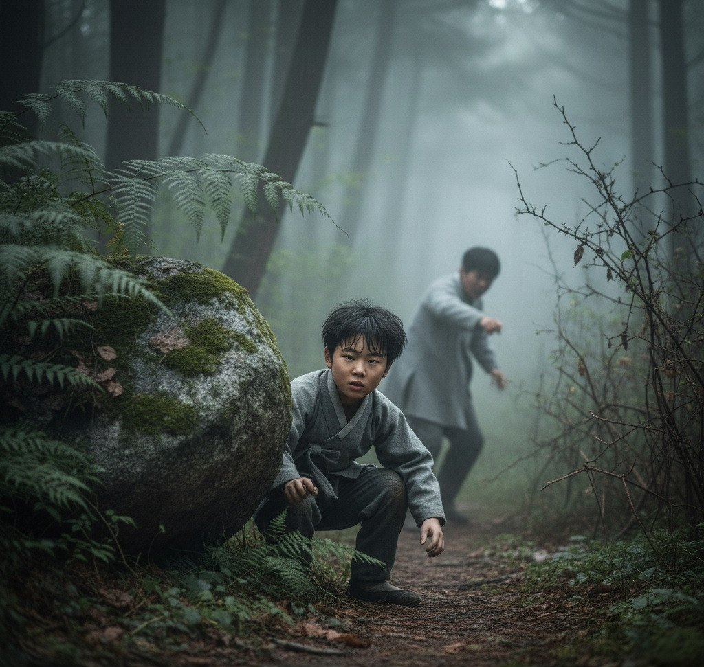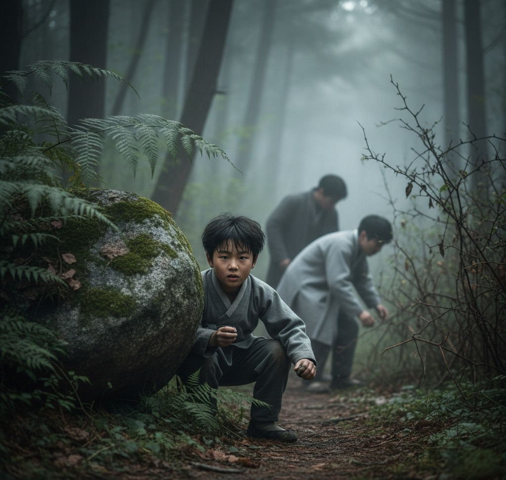 나뭇가지들이 얼굴을 할퀴었지만 멈출 수 없었다. 뒤에서 두 명의 추격자가 거친 숨소리를 내며 쫓아왔다."이쪽으로 갔다!""놓치면 안 된다!"산돌이는 어릴 때부터 이 산을 뛰어다니며 자란 덕분에 지형을 잘 알고 있었다. 그는 큰 바위 뒤로 몸을 숨기고 숨을 죽였다.