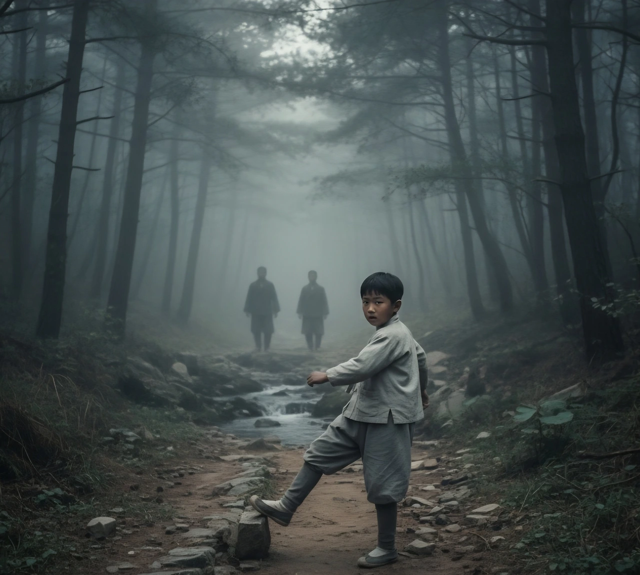 뒤에서 따라오던 발소리가 잠시 멈췄다가 다시 들렸다.'역시 미행이다.'산돌이는 침착하게 주변을 살폈다. 좌우로는 울창한 숲이 우거져 있고, 앞으로는 작은 개울이 흐르고 있었다. 그는 갑자기 뛰기 시작했다.