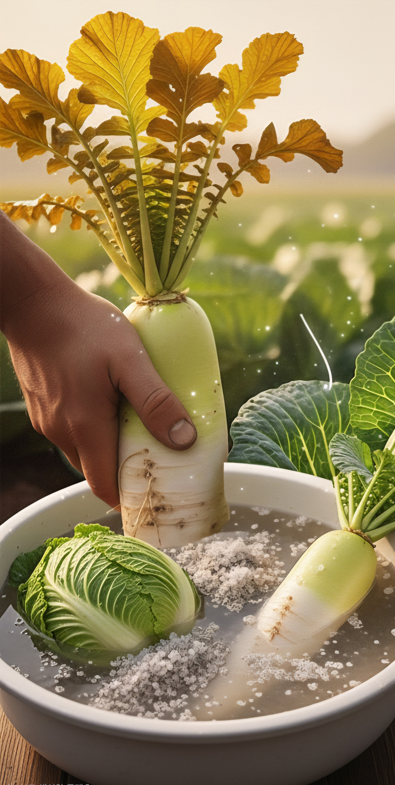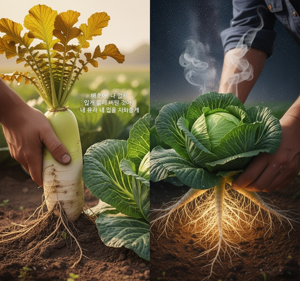 가을이 왔다. 잎이 노랗게 물들고, 추위가 다가오자 농부가 그들을 거두기 시작했다. 무는 땅속 깊이 파묻혀 그녀를 지키려 애썼다. "배추야, 나 없이 어떻게 버틸 거야? 내 뿌리가 네 잎을 지켜줄게." 하지만 배추는 부드럽게 웃었다. "무야, 삶은 변화를 받아들이는 거야. 우리는 사랑으로 하나가 되었어. 이 변화가 우리를 더 깊이 묶을 테니까."