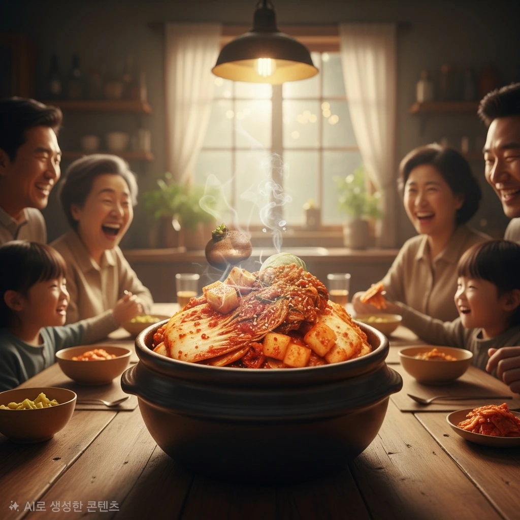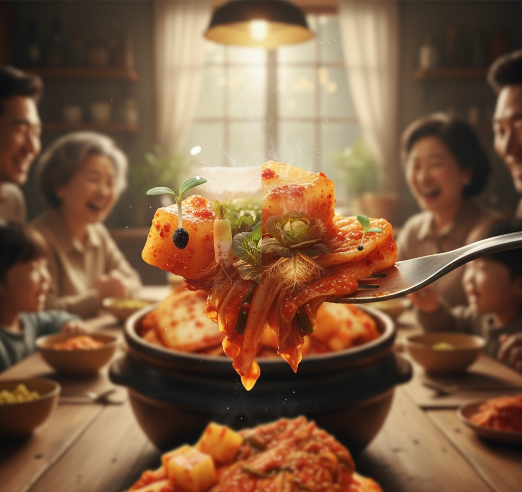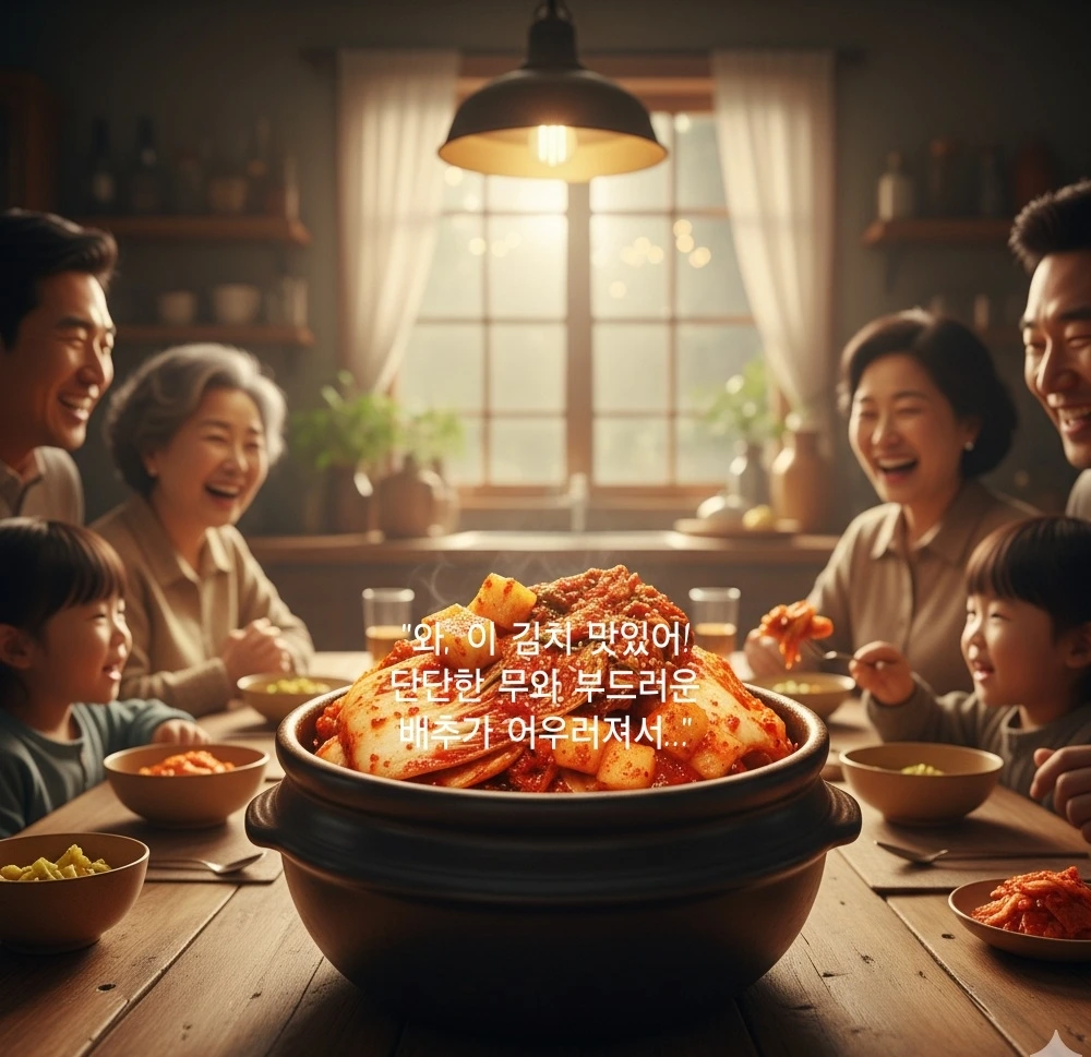 겨울, 추운 식탁 위에 김치 그릇이 놓였다. 무김치와 배추김치가 섞여, 붉은 양념에 물든 채 빛났다. 가족들이 포크를 들고 그들을 맛보았다. "와, 이 김치 맛있어! 단단한 무와 부드러운 배추가 어우러져서..."
