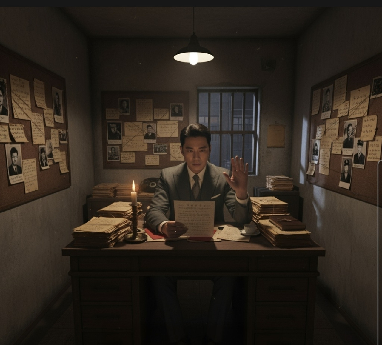 영광경찰서 뒤편의 작은 사무실에서 정혁진은 혼자 서류들을 정리하고 있었다. 벽에는 학당 화재 사건의 관련 인물들 사진과 정보가 빼곡히 붙어있었다.