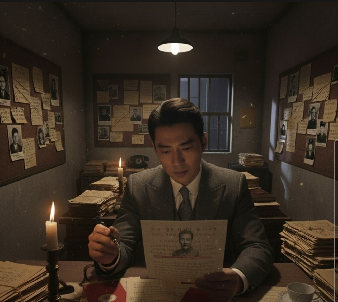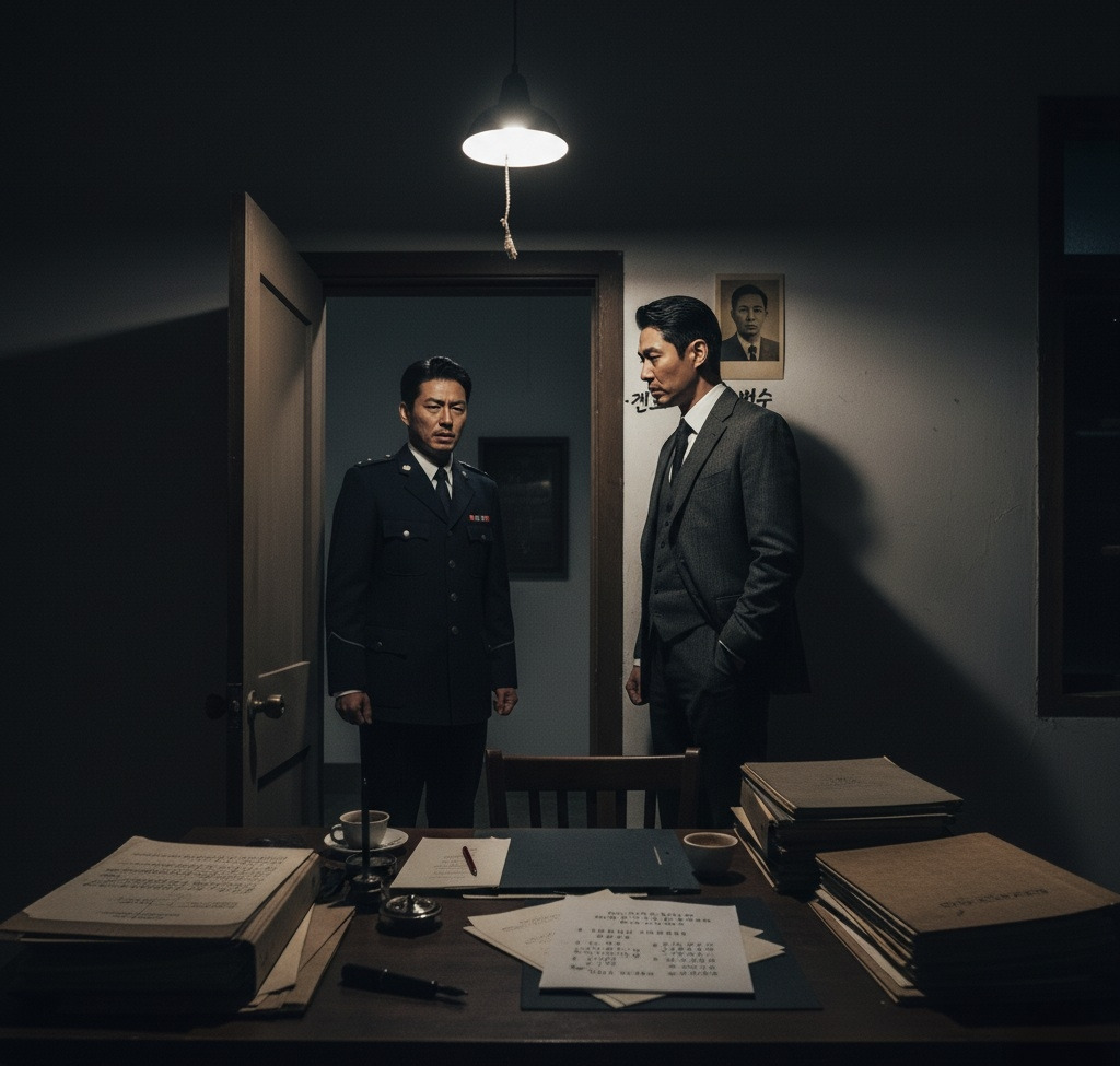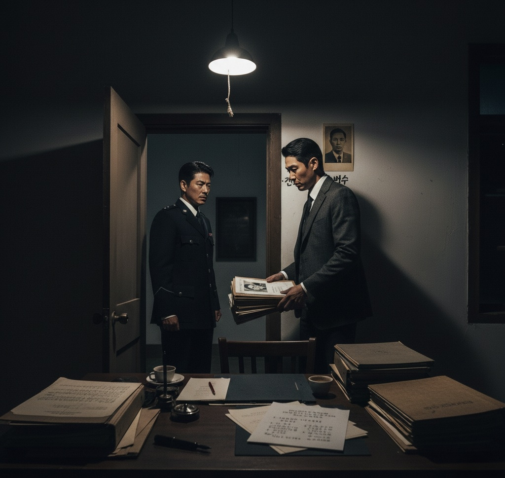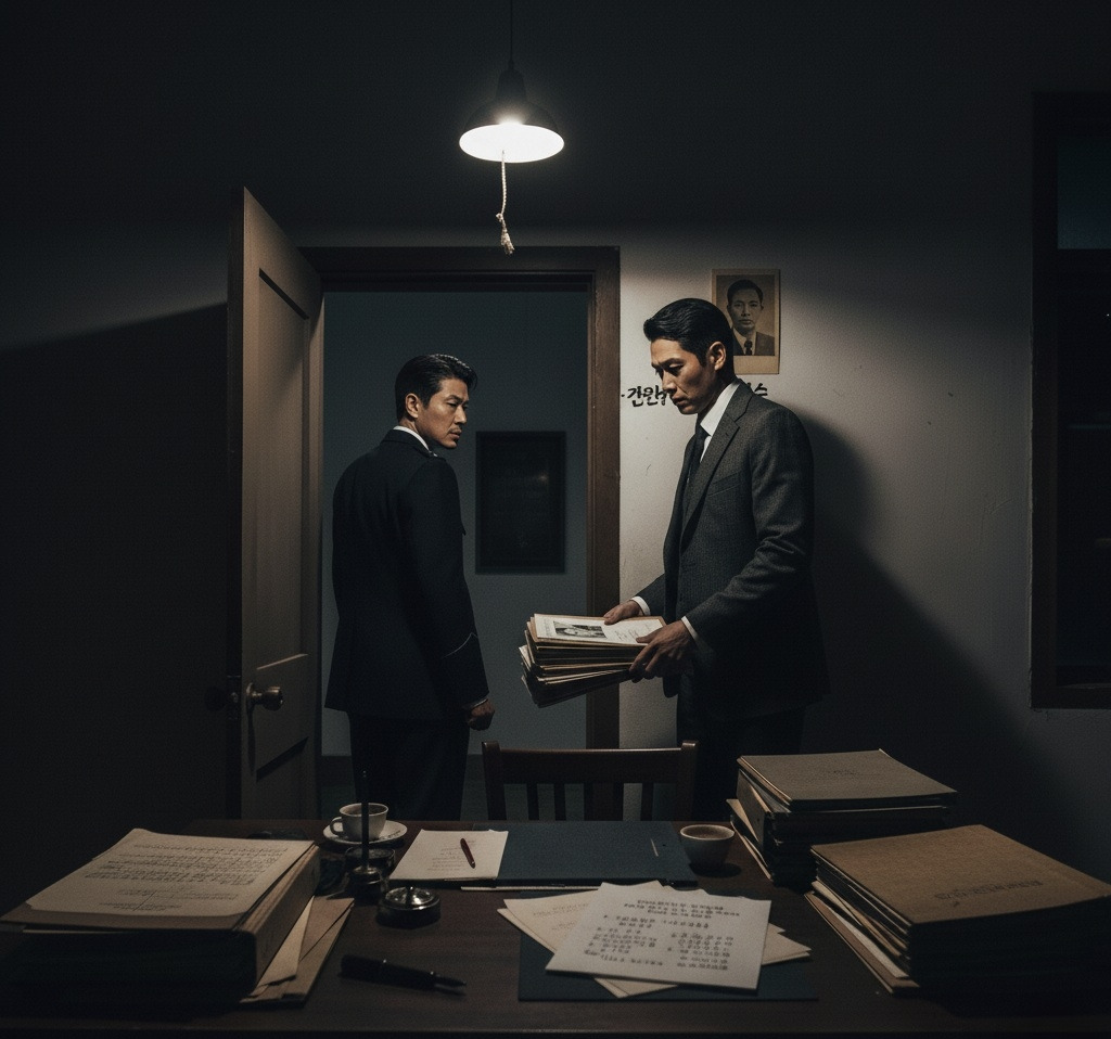 그가 펜을 놓는 순간, 복도에서 발소리가 들렸다. 정혁진은 재빨리 서류들을 서랍에 집어넣고 평범한 보고서를 펼쳤다.