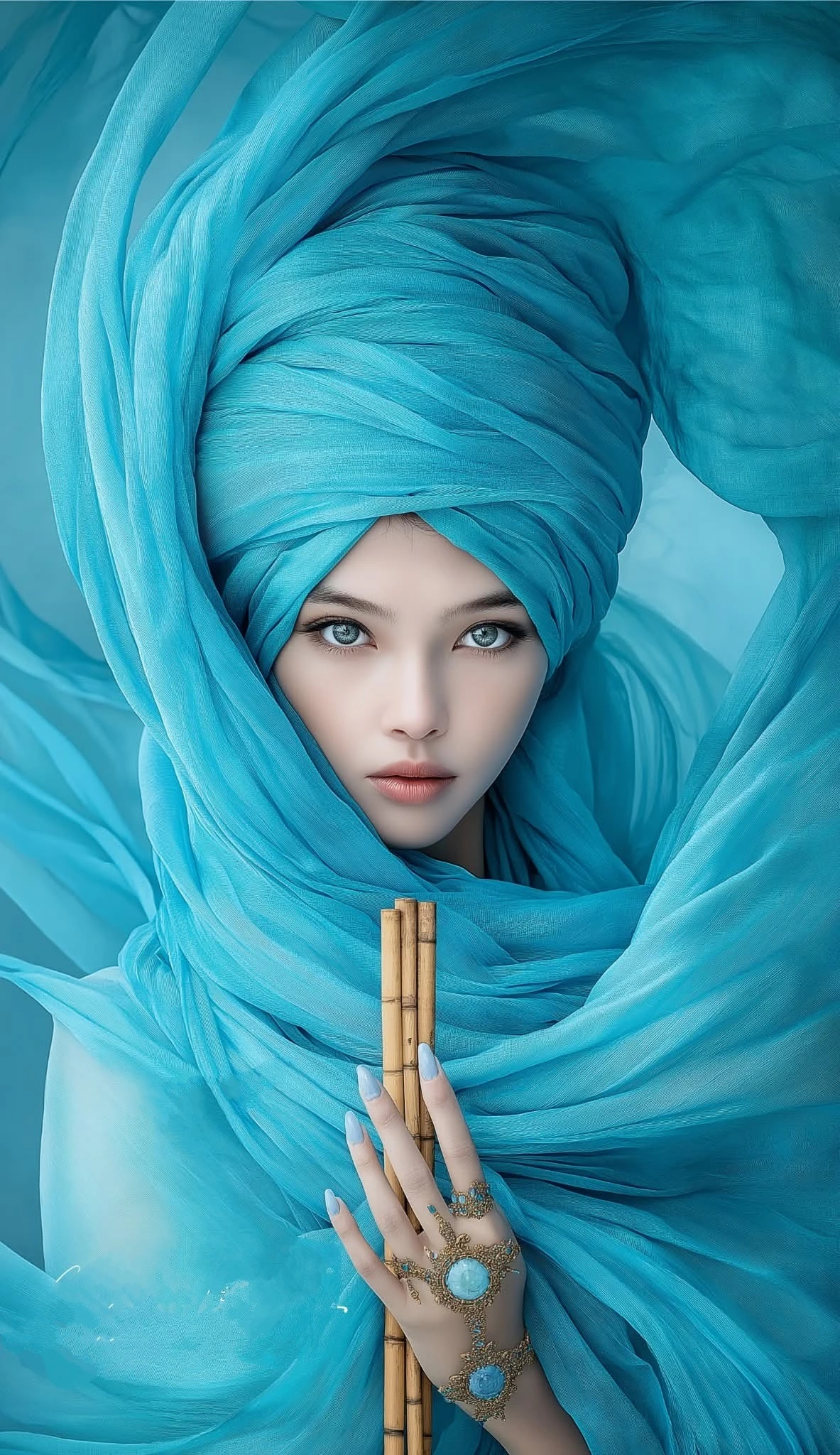 가는 손가락은 긴 대나무 조각을 조심스럽게 감싸고 있다. 섬세한 손가락 끝은 연한 하늘색 매니큐어로 칠해져, 푸른 베일과 어우러져 한 폭의 그림을 연상케 한다. 손등에 그려진 문양은 고대 문명의 상징 같기도 하고, 영롱한 보석으로 만들어진 장신구 같기도 하다. 그 문양은 그녀의 아름다움이 단순히 외면에 그치는 것이 아니라, 신비로운 역사와 이야기를 품고 있음을 암시한다.