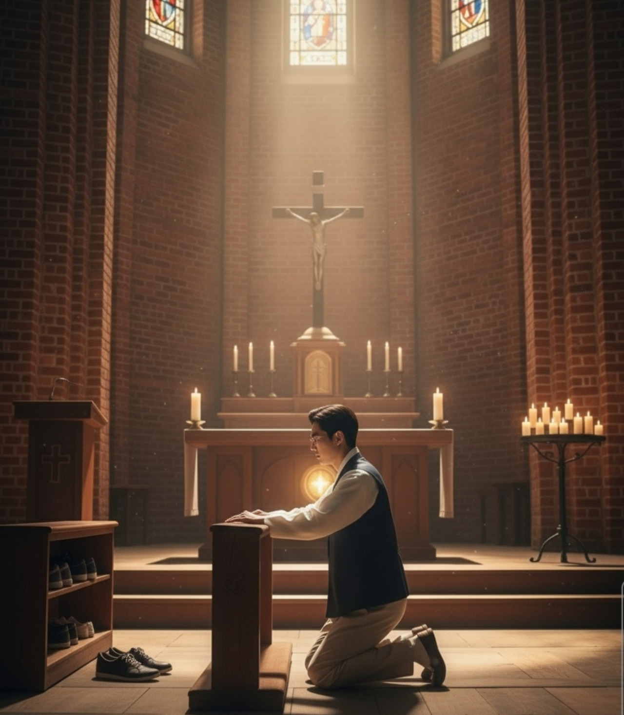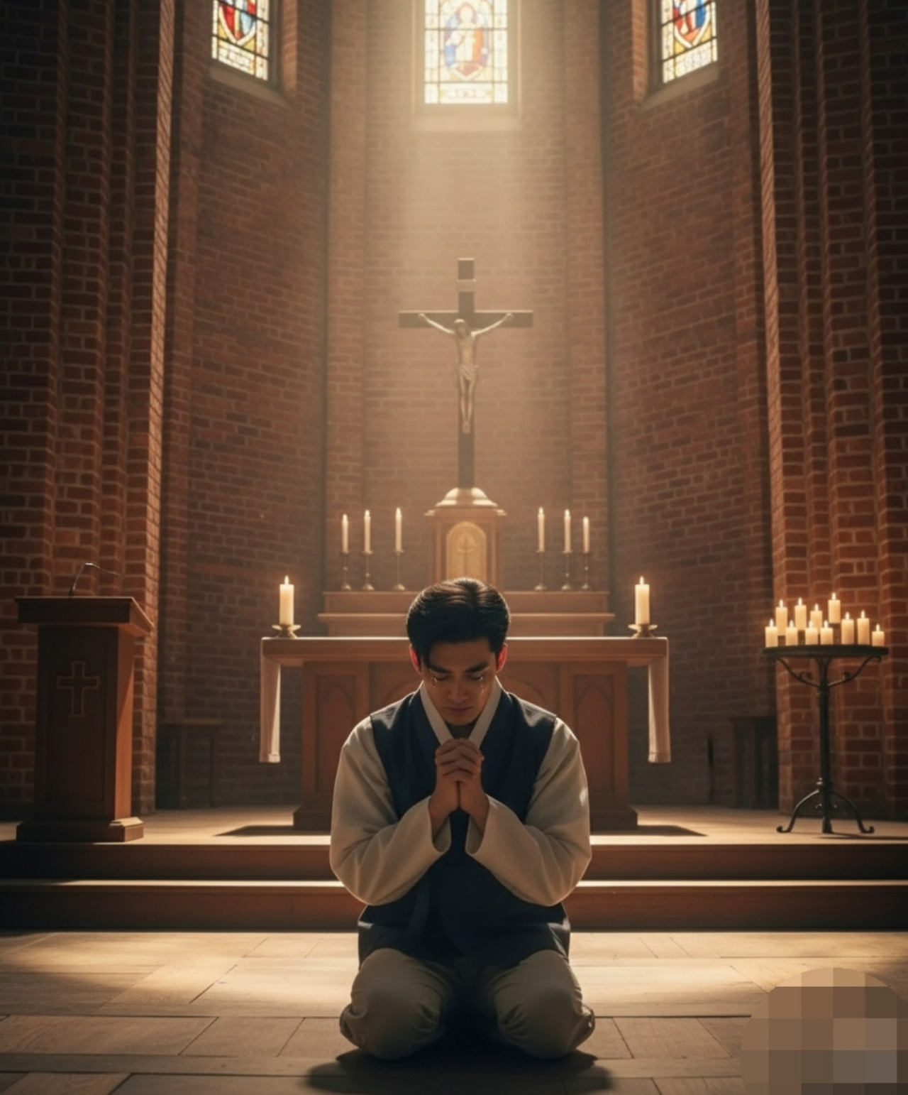 이산갑은 성당 입구에서 신발을 벗고 조용히 안으로 들어갔다. 나무 마룻바닥이 오래되어 삐걱거렸지만, 그 소리마저 경건하게 느껴졌다.제대 앞으로 다가간 이산갑은 무릎을 꿇었다. 제대 옆 감 실을 향해 난간에 손을 얹고 천천히 성호를 그었다.