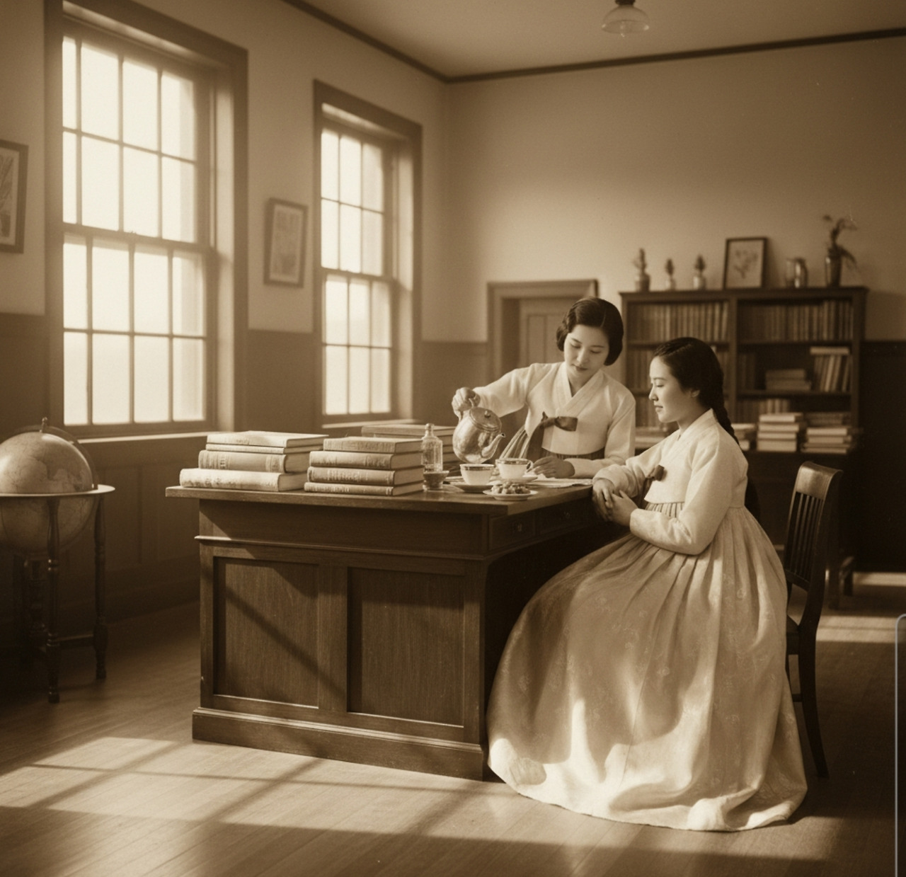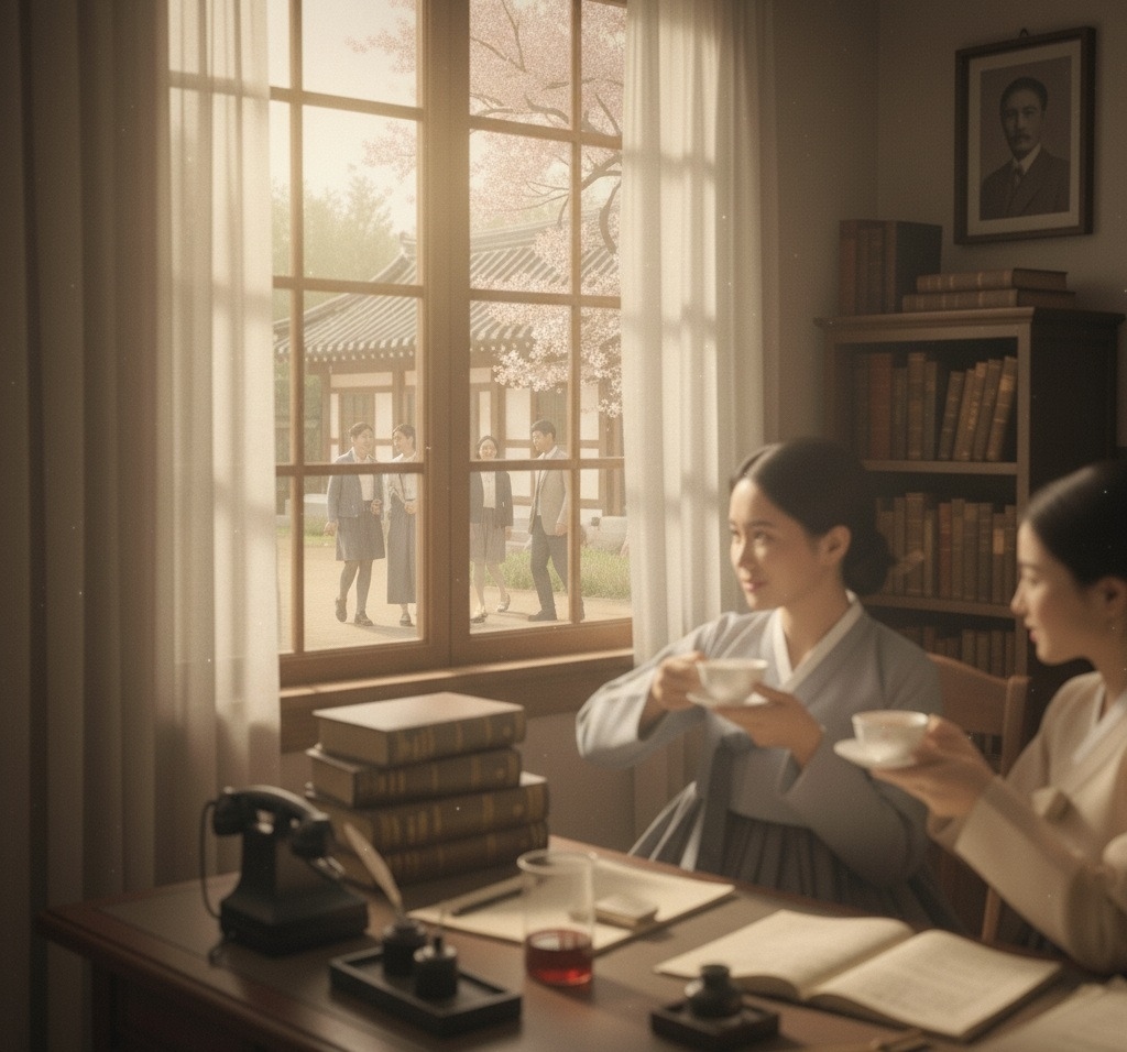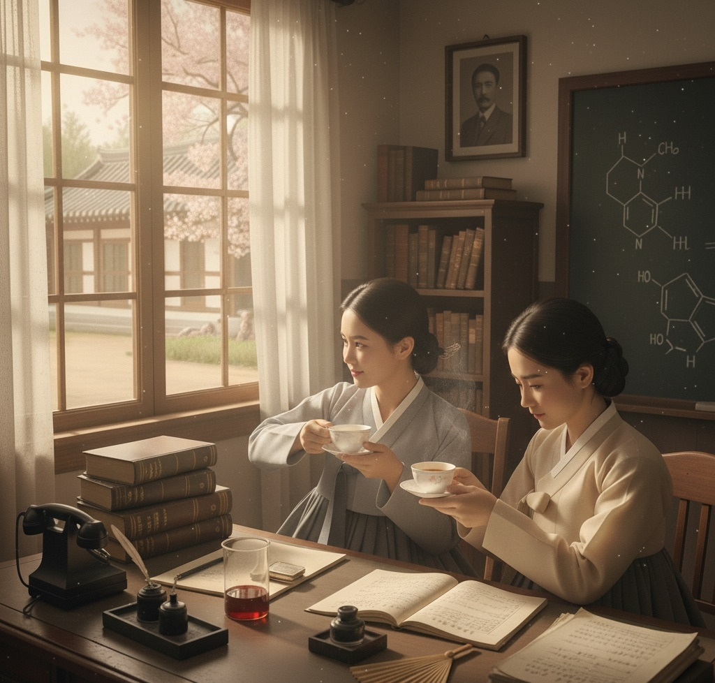 창밖으로 경성의 봄 햇살이 들어오는 교수실. 책상 위에는 영양학 서적들과 실험 기록지가 가지런히 놓여 있다. 강지윤이 차를 따르며 이은주에게 건넨다.