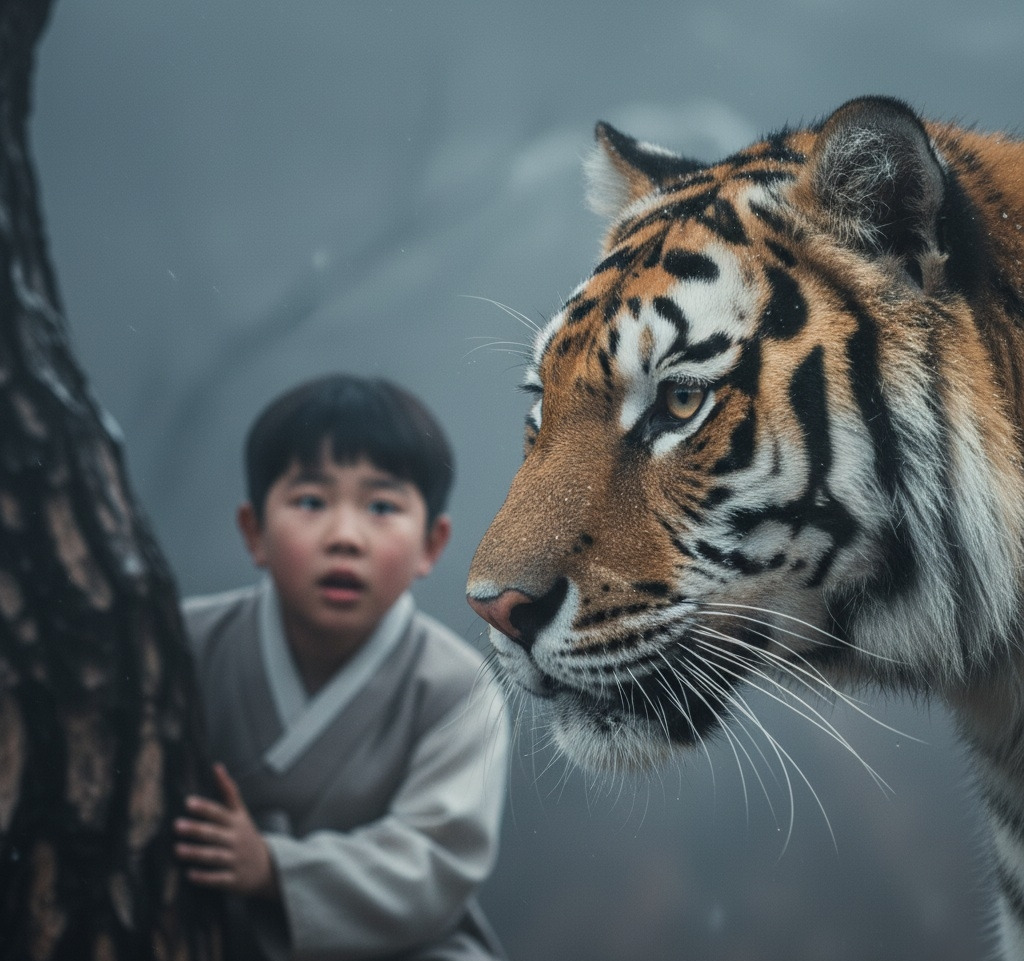 젖은 흙 냄새 속에서, 어린 사내 민수는 숨을 죽이며 나무 뒤에 몸을 숨겼다.