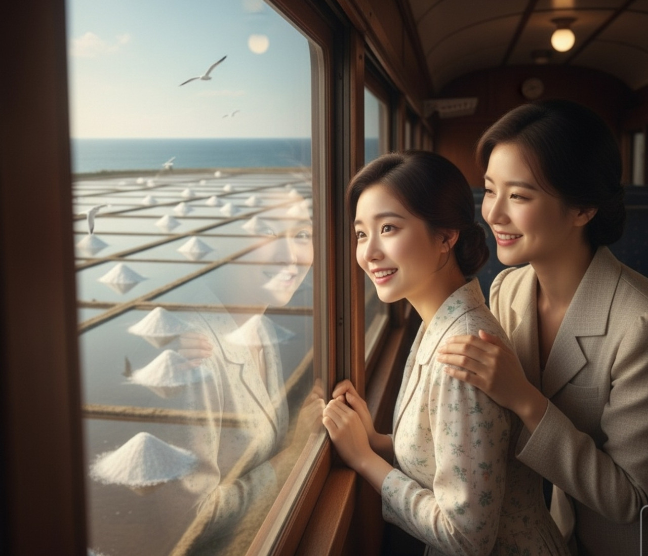 기차가 호남평야를 지나 서해안으로 접어들자, 창밖 풍경이 달라지기 시작했다. 푸른 바다가 멀리 보이고, 염전의 하얀 소금 더미들이 햇살에 반짝였다.