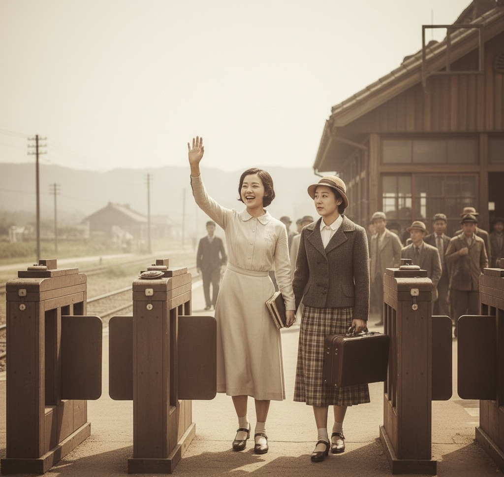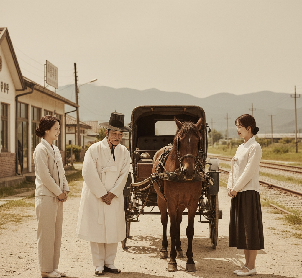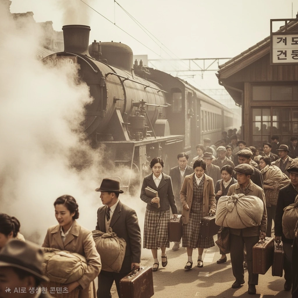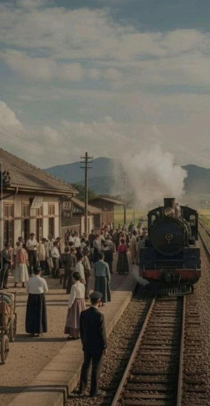 기차가 마침내 송정리 역에 도착했다. 증기가 플랫폼에 가득 퍼지는 가운데, 두 여인은 짐을 들고 내렸다. 많은 사람들이 봇짐을 들고 기차에서 내렸다.