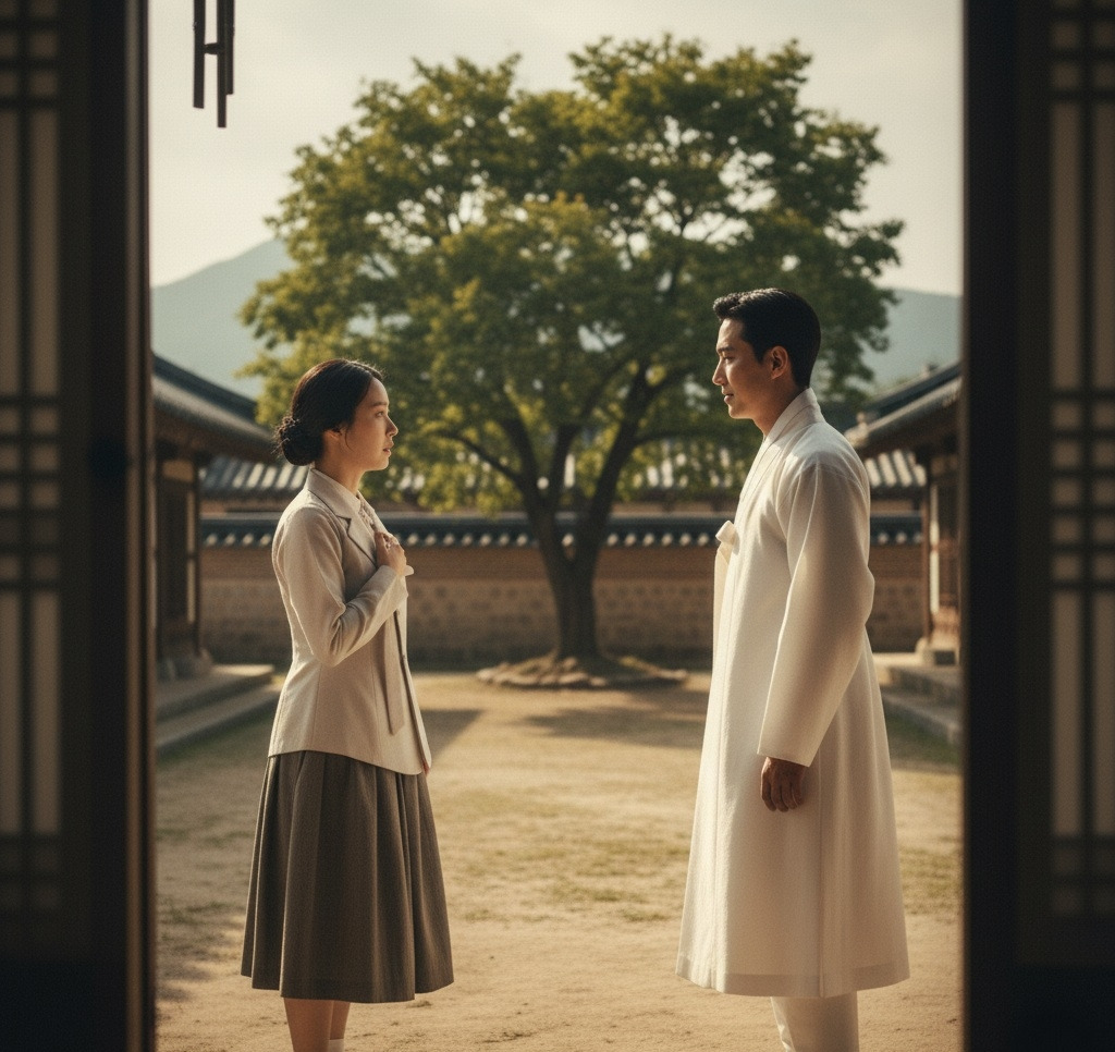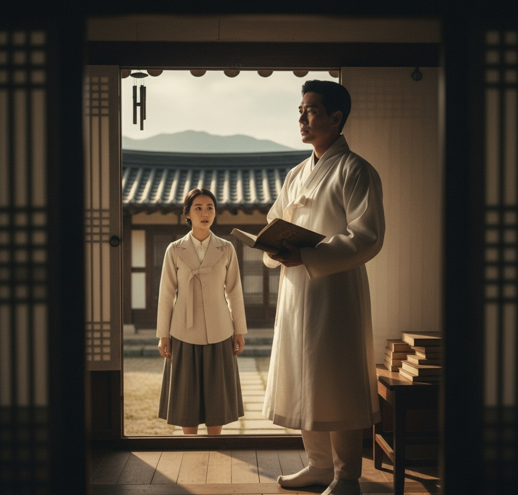 하얀 두루마기를 입은 그는 책을 손에 들고 있었다. 고개를 들어 강지윤을 바라보는 순간, 두 사람의 시선이 마주쳤다.