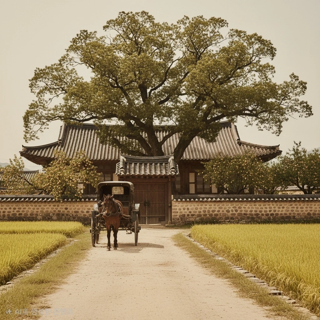 이윽고 큰 한옥 기와집 한 채가 보였다. 대문 앞에는 큰 느티나무가 서 있었고, 담장 너머로 살구나무가 보였다.