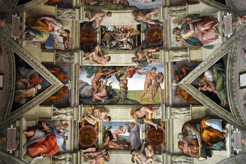 미켈란젤로, 천지창조 중 에덴에서의 추방(정중앙), 이브의 탄생(가운데 맨 하단), 시스티나 성당 천장벽화