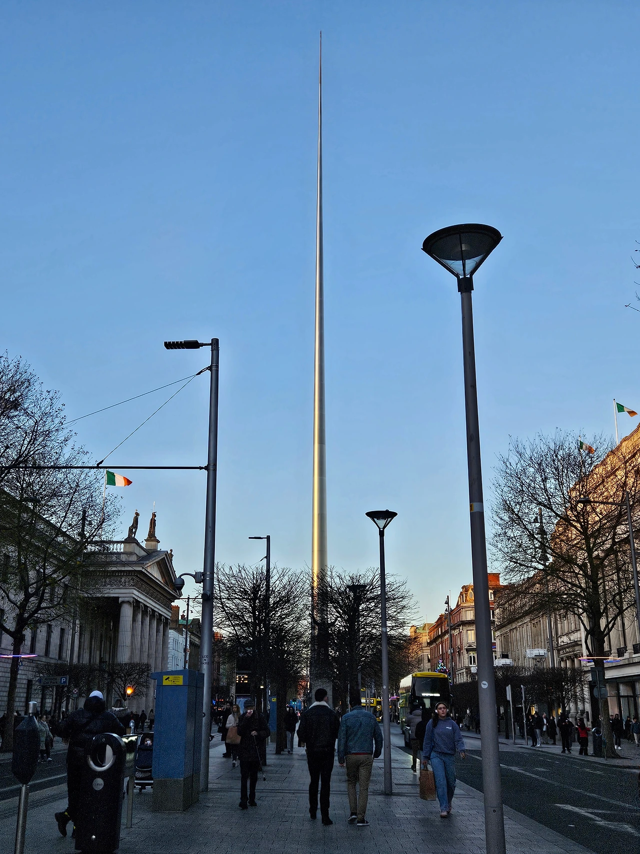 이 사진에 보이는 구조물은 더 스파이어(The Spire of Dublin) 또는 Monument of Light로 불리는 아일랜드 더블린의 랜드마크이다. 높이는 약 120m로, 세계에서 가장 높은 조형물 중 하나이고 이 스파이어는 오코넬 스트리트(O'Connell Street) 중심부에 위치하고 있으며, 현대적인 디자인과 심플한 스테인리스 스틸로 제작되었다고 한다