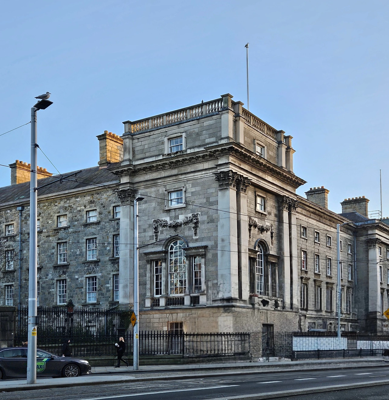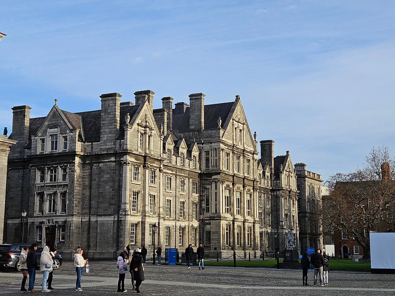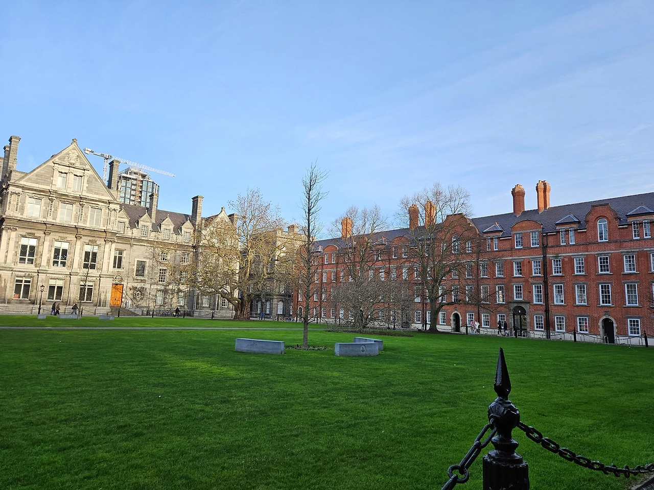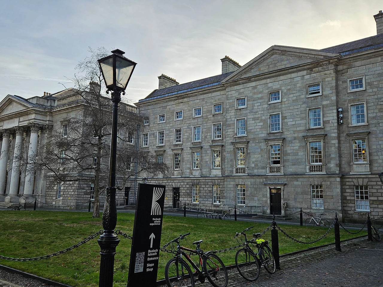 이 사진에 보이는 건물은 아일랜드 더블린에 위치한 트리니티 칼리지(Trinity College Dublin)의 메인 건물 중 하나이다. 트리니티 칼리지는 1592년에 설립된 아일랜드에서 가장 오래된 대학교로, 역사와 전통을 자랑하는 명문 대학이다.