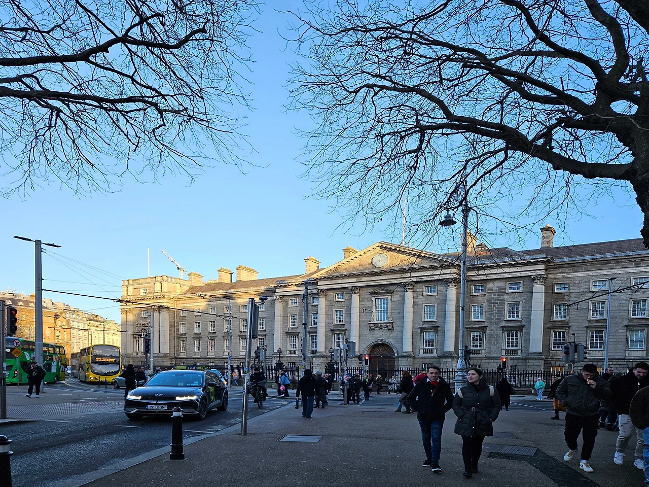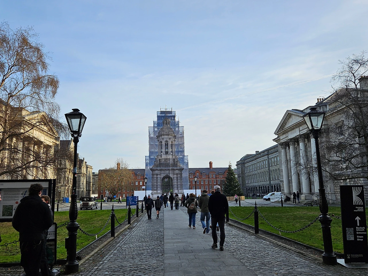 사진 속 장소는 트리니티 칼리지의 정문과 그 주변 거리로, 관광객과 현지 학생들이 자주 오가는 활기찬 분위기를 보여준다. 더블린의 주요 중심지에 위치하고 있어 여행자들이 쉽게 방문할 수 있는 명소 중 하나이다.