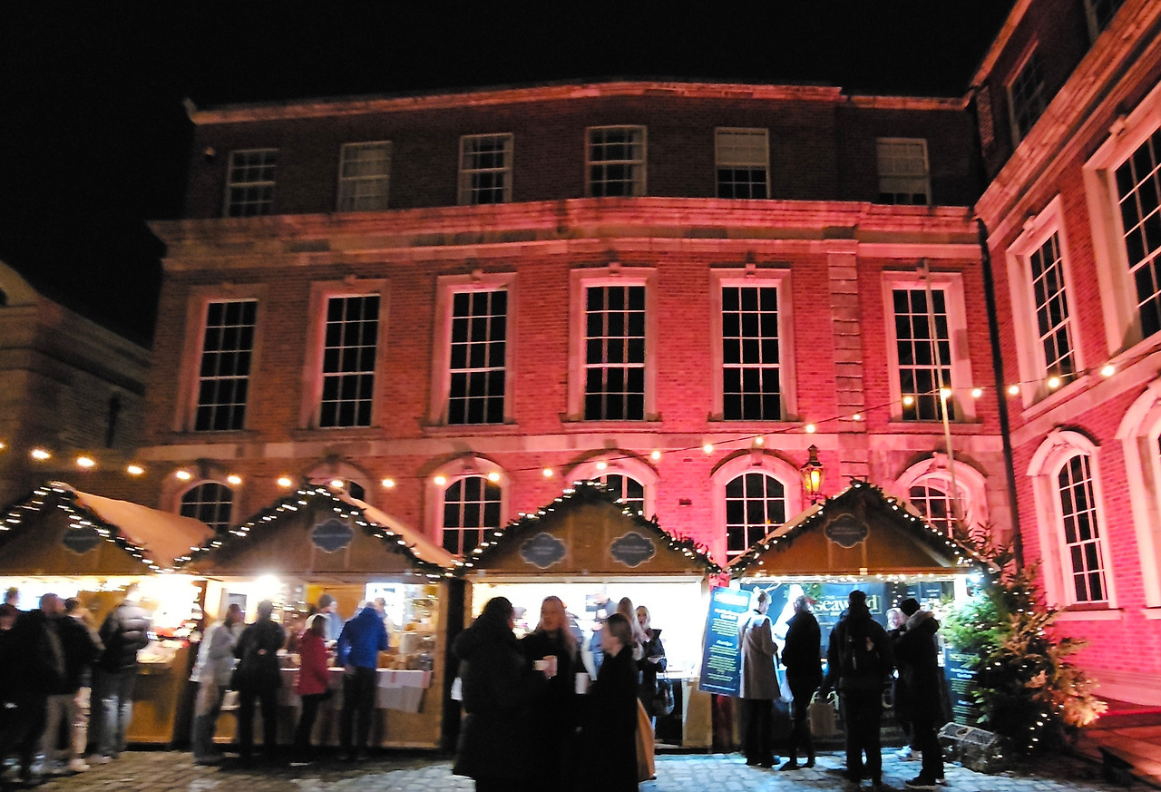 건물의 독특한 건축 양식과 조명 장식이 어우러져 역사적인 장소에 현대적인 축제의 따뜻함이 더해져 있다. 방문객들은 이곳에서