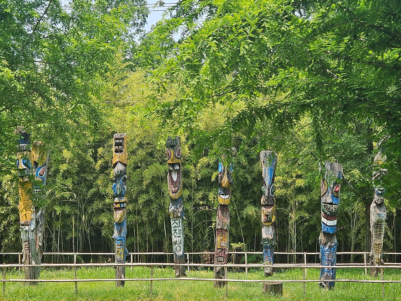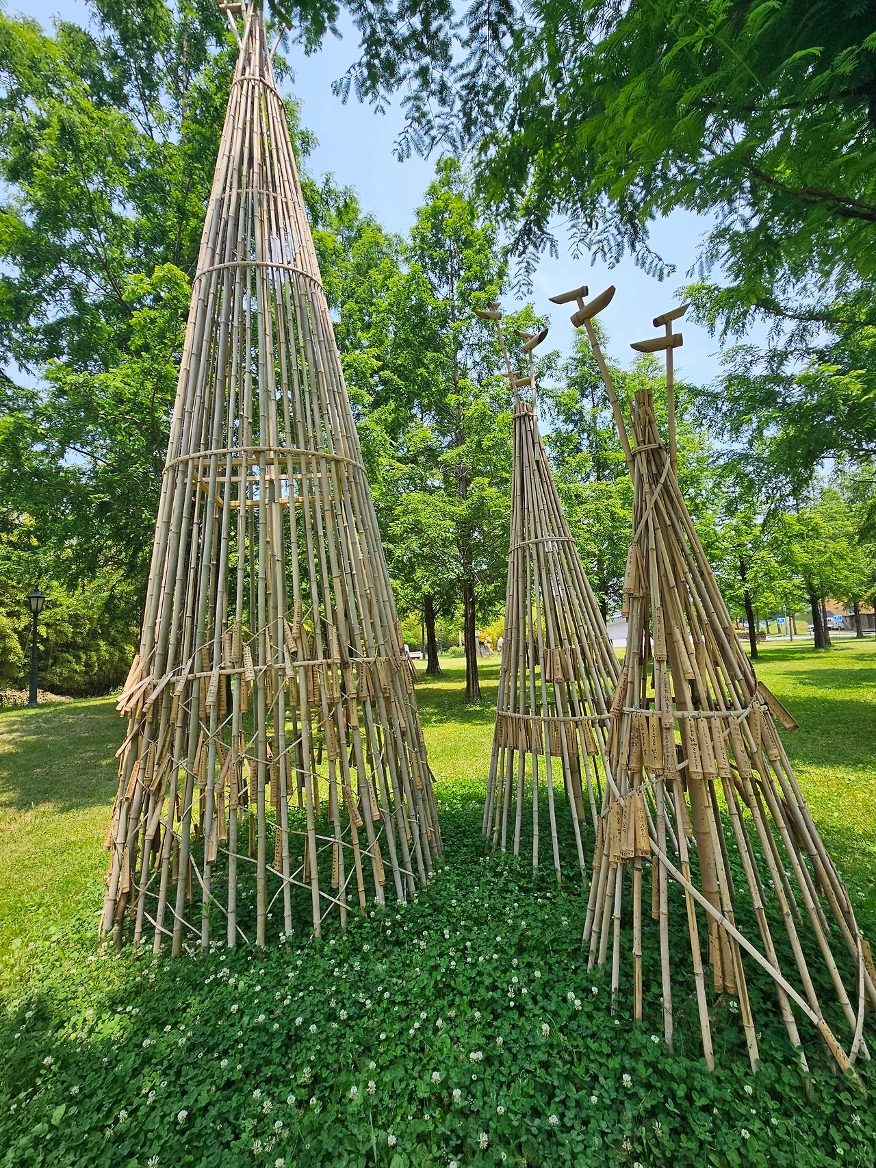 걷다 보면 넓은 잔디밭에 삼각형 모양으로 대나무를 엮어 만든 구조물이 보인다.