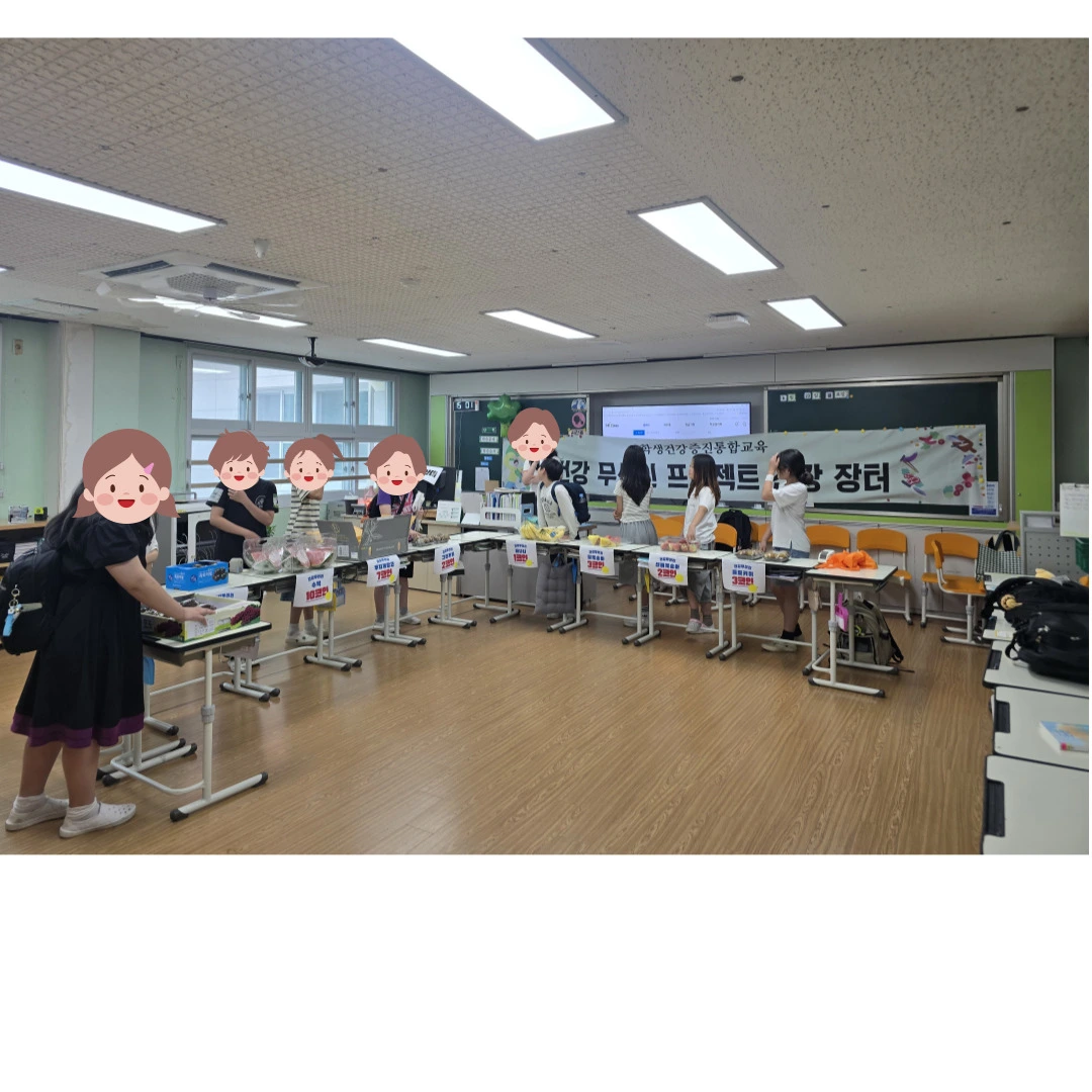 아이들은 건강장터에서 과일과 코인을 바꾸어 갈 수 있다.