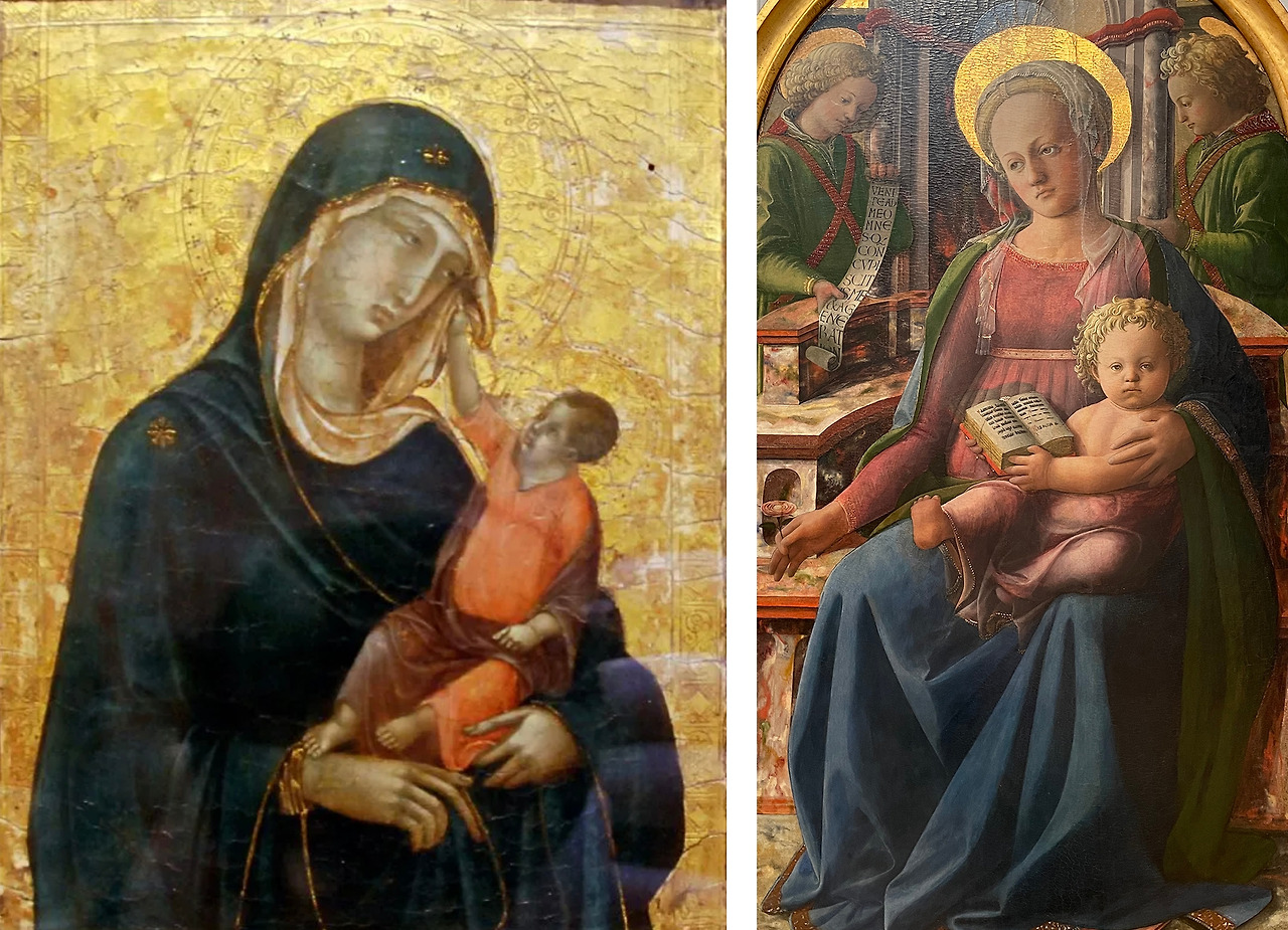 주지의 사실이지만 1400년대부터 이탈리아에서 미술에 큰 변화가 일어납니다. 돈을 잘 버는 상인 계층이 형성되면서 이들이 교회에 돈을 많이 기부하게 되었고, 교회에서 돈을 받고 일을 하는 프로페셔널 예술가들이 다시 나타나지요. 1400년쯤부터 이탈리아의 피렌체에서 르네상스가 시작하는데요, 그 이전 1300년대에 조금씩 변화를 알리는 선구자들이 나타납니다. 메트로폴리탄 박물관에서는 이 시기의 건축물을 볼 수는 없지만 그림과 조각품을 다수 전시하고 있습니다. 이 박물관 소장품을 통틀어 가장 많은 돈을 들여서 구입했다는 그림이 두치오 (Duccio)라는 화가가 그린 <마돈나와 아기 예수>인데 2004년에 4천5백만 불을 주고 샀다고 합니다 (아래 그림 왼쪽 참조). 이 그림이 뭐가 그리 대단하냐고요? 중세의 성모 마리아는 대부분 무표정이었고 아기 예수는 근엄한 애 늙은이 같이 묘사했었는데요, 이 그림에서는 성모 마리아가 사랑하는 엄마의 시선으로 아기 예수를 바라봅니다. 웃는 얼굴은 아니고 이 아기가 나중에 십자가에 못 박힐 운명이라는 것을 아는 듯 한, 사랑과 슬픔이 교차하는, 그러한 그윽한 눈빛을 하고 있습니다. 그리고 아기 예수도 자신의 엄마를 바라보며 엄마의 머리를 쓰다듬습니다. 작은 아기가 엄마를 위로하는 듯합니다. 아직은 르네상스 시대 이전이라 아기가 아기 같아 보이지는 않습니다. 하지만 르네상스로 가는 시기에 있는 몇 안 되는 중요 작품이라 큰돈을 써서 구입했다고 하네요.