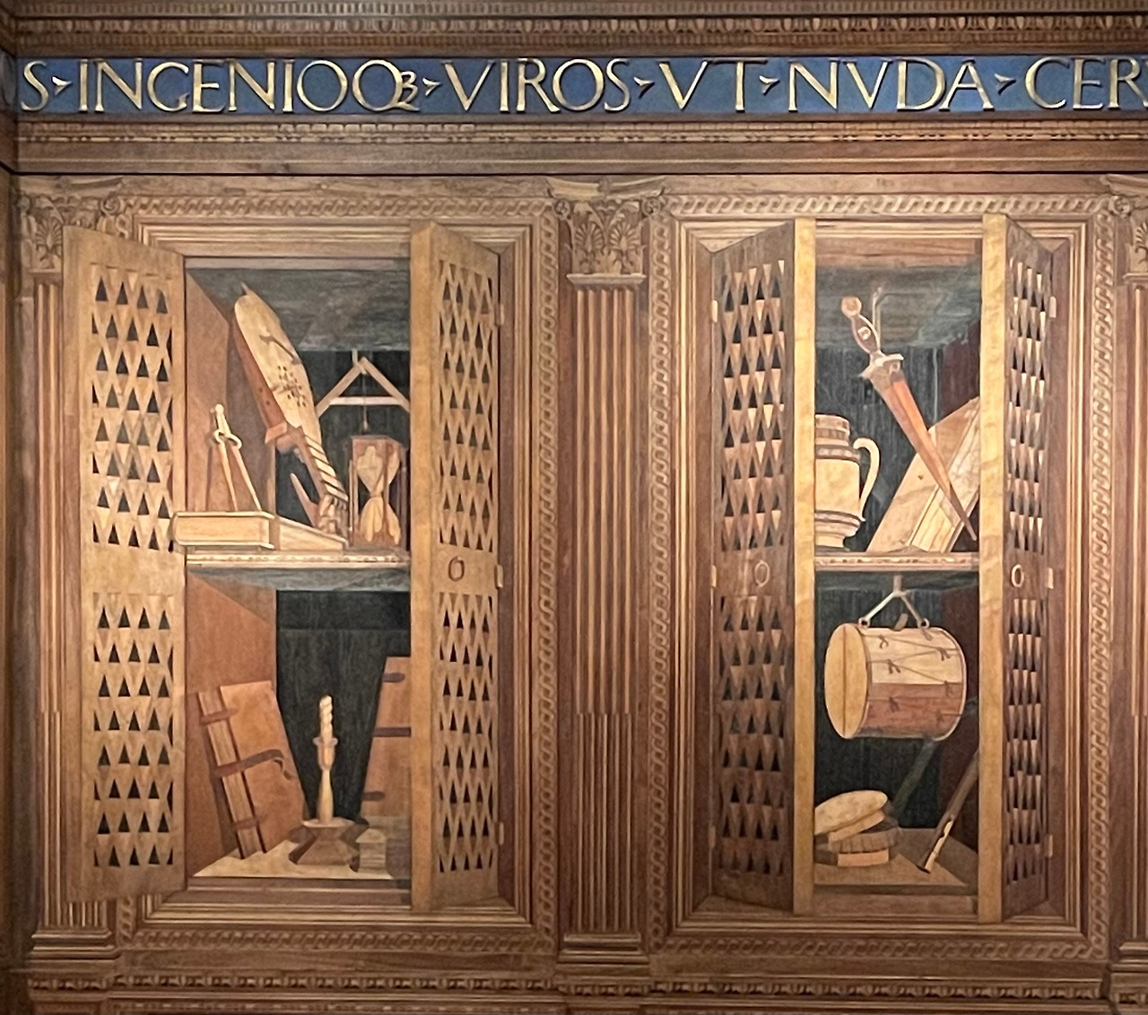 이 박물관 안에 원근법이 개발된 초창기 시절 중요한 전시물이 있는데, 대부분의 방문객들을 그 의미를 모르고 지나칩니다. 피렌체 근처에서 활약하던 프레데리코 몬테펠트로 공작 (Frederico da Montefeltro)의 서재입니다. 이 서재의 주인은 학식과 무술이 뛰어났다고 하는데, 칼싸움을 하다가 한쪽 눈을 잃은 인물이었습니다. 눈이 하나 밖에 없었으니 세상을 싱글 렌즈로 보며 살던 사람이었습니다. 그러니 3차원의 세상을 싱글 렌즈로 보듯이 표현하는 원근법에 감명받아 르네상스 미술의 중요한 후원자가 됐습니다. 그의 서재는 색상이 다른 나무 조각들을 꽤 맞추어 장식을 한 가구들과 나무벽으로 가득합니다. 검은색을 내기 위해서 나무를 불에 그을리기도 했다고 하고요. 원근법의 원리를 이용해서 만든 평평한 나무 벽면의 패턴이 보는 이로 하여금 마치 3차원 공간을 보는 듯한 착각을 하게 합니다 (아래 그림 참조).