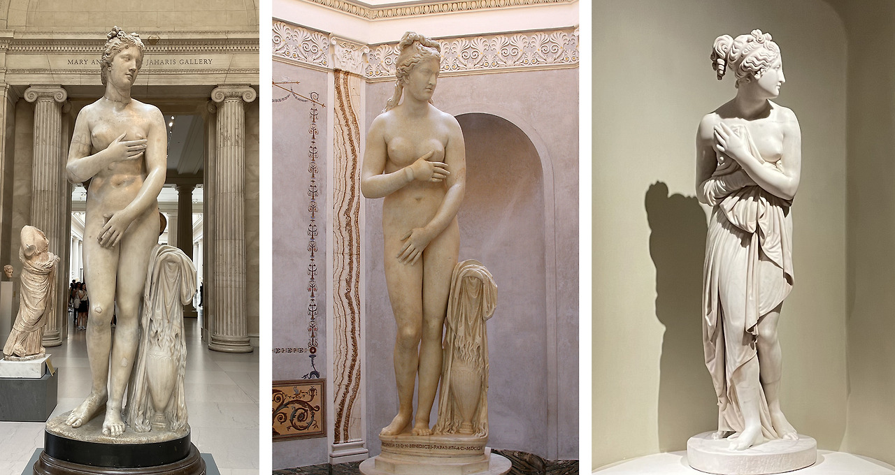 뉴욕이 자랑하는 메트로폴리탄 박물관의 입구를 들어서면 그 왼편에 그리스-로마 전시장이 자리하고 있습니다. 입구 가까이는 이곳의 대표적인 고대 그리스 석상들이 진열돼 있고, 여기서 긴 통로를 따라가면 로마 전시관이 나옵니다. 이곳을 찾는 관람객들이 모두 이 중앙 통로를 이용해야 하니 여기에 이 박물관에서 제일 자랑스러워하는 로마 석상들이 진열돼 있습니다. 그 통로의 한가운데에 두 손으로 자신의 벌거벗은 모습을 가리는 비너스/아프로디테 석상이 하나 서 있습니다. 자신의 모습을 가리는 그 모습이 역설적으로 관능미를 부각하기에 사람들이 이 석상을 더욱 주목합니다. 미술 역사가들은 이 포즈를 가리켜 비너스 푸디카 (Venus Pudica)라고 부르곤 합니다.