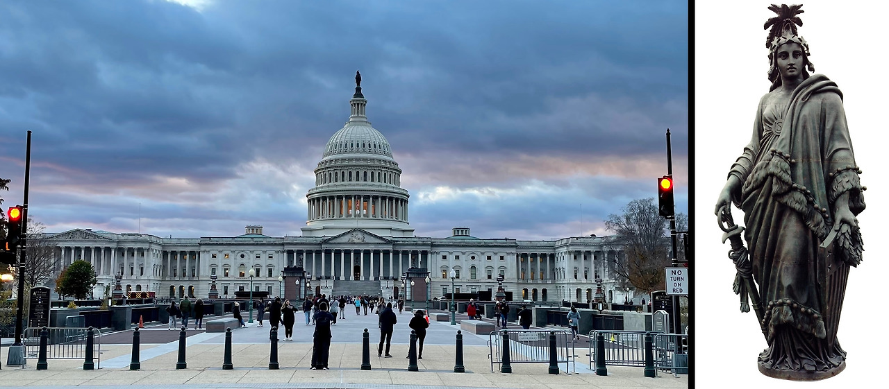 이러한 자유의 여신이 더욱 주목을 받은 계기는 워싱턴 DC의 캐피톨 힐 (Capitol Hill) 언덕에 위치한 미국 국회의사당 건물 증축과 관련이 있습니다. 19세기 초반 아담한 규모로 지어졌던 의사당 건물은 몇십 년 후 서부 개척을 통해 미국이 팽창하면서 증축의 필요성이 생겼습니다. 그 증축 계획의 일환으로 건물을 넓히고, 그 위에 멋진 원형 돔을 얹고, 또 그 꼭대기에 미국을 상징하는 여신을 세우기로 했습니다. 이것이 1860 년 남북전쟁이 일어나기 조금 전 일인데요, 이 계획에 깊게 관여했던 인물이 훗날 남부 분리주의자들의 대통령이 된 제퍼슨 데이비스 (Jefferson Davis)입니다. 남북 전쟁 이전에 상원 의원의원으로서 노예 제도의 수호를 강력히 주장했던 데이비스였으니 당연히 로마 시대 노예 해방의 상징이었던 자유의 여신 표현에 몇 가지 제동을 걸었습니다. 그 결과로 만들어진 것이 로마의 리버타스와는 달리 막대기 대신에 칼을 들고, 해방된 노예들이 쓰던 필레우스 모자의 모양이 바뀐 동상인데, 그 이름도 로마의 여신 리버타스 (Libertas)가 아닌 프리덤 동상 (Statue of Freedom)으로 명명됐습니다. 그런데 의사당 돔을 짓기 직전에 남북전쟁이 터졌고 제퍼슨 데이비스는 워싱턴을 떠났습니다. 그리고 노예 해방론자였던 미국 대통령 아브라함 링컨이 전쟁 중 의사당 증축을 마쳤습니다. 지금의 미국 의사당 꼭대기에는 그 복제품이 서 있고, 원래의 자유의 여신상은 의사당 내부에 진열돼 있습니다 (아래 그림 참조).