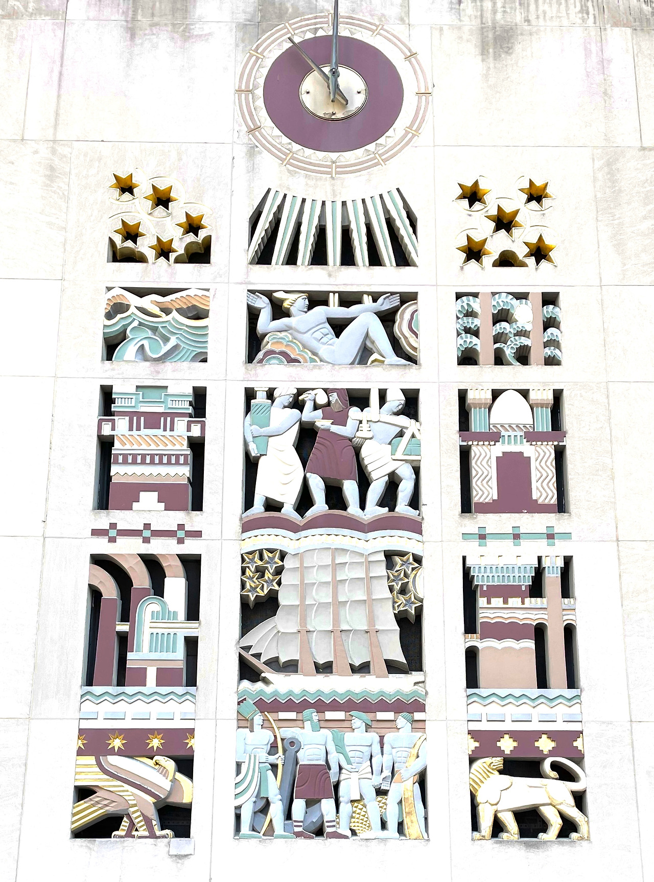 대영제국 건물 바로 남쪽에는 프랑스를 대표하는 라 메종 프랑세즈 (La Maison Francaise) 건물이 서있습니다. 이 입구에 프랑스를 표현하는 황금빛 청동 부조가 보입니다 (아래 그림). 이 부조를 만든 알프레드 자니오 (Alfred Janniot)는 프랑스의 대표적 아트데코 조각가라지만 디테일로 가득 찬 이 부조는 전형적인 아트데코라기보다는 19세기 유럽 전통을 따른 느낌을 줍니다. 이 부조의 상단에는 프랑스와 미국을 상징하는 인물들이 나란히 앉아 있습니다. 프랑스를 상징하는 인물은 노트르담 대성당을 품고 있고, 그 뒤에는 "파도에 흔들리나 침몰하지는 않는다"는 파리의 모토가 적힌 휘장이 보입니다. 이 여인의 손가락은 오른편에 있는 미국을 상징하는 인물의 손과 맞닿아 있으니 두 나라의 우정을 표현합니다. 미국을 상징하는 인물의 뒤편으로는 맨해튼 스카이라인이 보입니다. 그 바로 아래에는 평화를 상징하는 비둘기들이 있고, 그 밑에는 프랑스인들의 세 가지 덕목을 상징하는 아름다운 여성들이 서 있습니다. 왼쪽의 여성은 시 (poetics)를, 중앙에 서 머리를 다듬고 있는 누드 여성은 아름다움 (beauty), 오른쪽에 있는 여성은 우아함 (elegance)을 상징한다고 새겨져 있습니다. 자신들의 아름다운 모습이 자랑스럽다는 것을 표현하는 듯한데, 피나는 노력과 허리가 휘는 노동을 통해 대제국을 건설했다는 대영제국 부조와는 주는 메시지가 사뭇 다르군요. 여하튼 프랑스는 지금까지도 예술적 전통과 패션 산업에 있어서 둘째가라면 서러워하는 국가이죠.