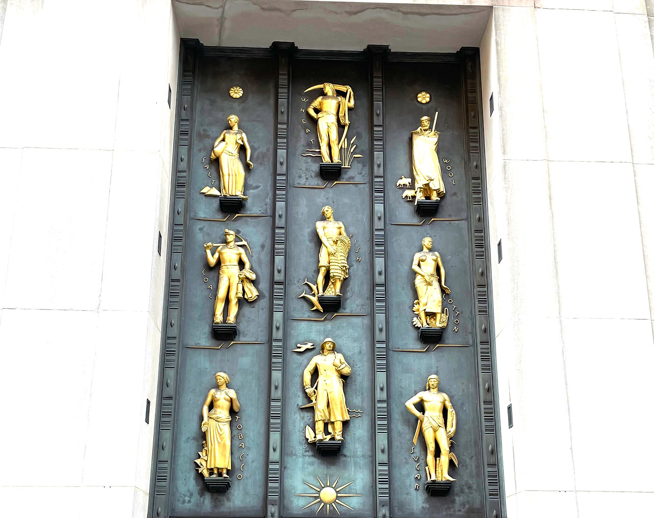서방 세계가 무역과 세계화를 통해 온 세계가 부러워하는 번영을 해 온 것이 수백 년이 됐습니다만, 그 기조가 항상 유지됐던 것은 아닙니다. 소수에 의한 폭력이 세계적 분노를 일으키며 무역과 인적 교류를 통한 공동 번영에 찬물을 끼언곤 했지요. 2차 세계 대전도 예외가 아니었습니다. 원래 팔라쪼 드이탈리아 건물의 입구에는 아틸리오 피치릴리 (Attilio Piccirilli)라는 이탈리아계 미국 작가가 만든 <영원한 젊은이여 항상 앞으로 (Sempre Avanti Eterna Giovinezza)> 부조가 있었습니다. 그런데 1941 년 일본이 진주만을 폭격하면서 분노한 미국인들이 이 작품을 나무로 덮어 버렸습니다. 무솔리니의 정부가 일본과 동맹을 했다는 것, 그리고 무솔리니의 지지층이 이탈리아 젊은 층이었다는 이유로 이 부조가 파시스트의 메시지를 전하고 있다는 주장 때문이었습니다. 이를 만든 피치릴리는 무솔리니와 아무 상관도 없었고, 또 록펠러 센터에 있는 그의 또 다른 부조 작품은 문제 되지도 않았으니 작가가 무척 억울했을 것 같습니다. 하지만 감정이 가득한 민중의 분노 앞에서 논리와 대화는 통하지 않습니다. 결국 1968 년 그 부조는 현재의 <이탈리아>로 불리는 청동 부조로 교체됐습니다. 포도나무와 밀을 묘사하며 이탈리아의 농경 산업을 묘사한 부조인데 (아래 그림 오른쪽), 이제 논란을 일으킬 일도 없지만 동시에 사람의 시선도 끌지 못하네요.