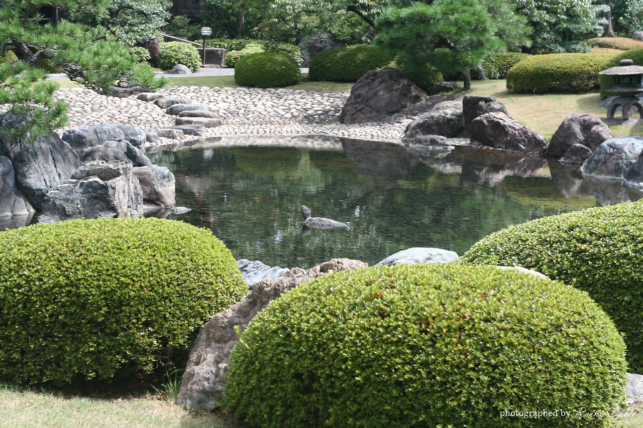 니노마루고덴에서 가장 재미있는 것은 바로 그 유명한 Nightingale Floor(鴬張りの廊下, 꾀꼬리 소리 복도)다. 복도를 걸을 때 삐걱거리는 소리가 나는데 꽤나 하이톤으로, 이 소리가 꾀꼬리 소리처럼 들린다 해서 저런 이름이 붙었다. 목적은 도쿠가와 이에야스가 암살자 침입을 방지하기 위해서 의도적으로 이렇게 만든 것인데, 과연 닌자의 나라답다. 마룻바닥 밑에 약간 유격을 두고 못 같은 것이 설치되어 있어 무게가 가해져서 바닥이 내려가면 그 못과 마찰이 되며 소리가 나는 구조(대충 이렇게 설명이 되어 있었음)인데, 밤에 시종이 시중을 들러 오는지 암살자가 침입한 것인지 어떻게 구별하지?라는 의문이 들기도 했지만. 니노마루고덴을 나와서 니노미야테이엔(二の丸庭園, 니노마루정원)과 해자 등을 구경했다. 교토는 평지다 보니 혹시 공격군이 있다면 농성한다 해도 방어 효과는 크지 않았겠지만 어쨌든 깊지는 않아도 해자까지 파 놓은 걸 보면 제대로 된 성이기는 하다.