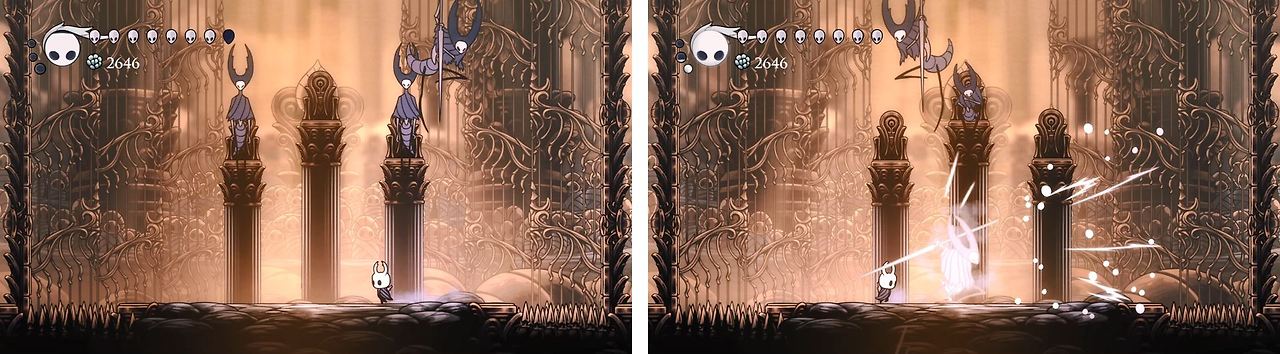 할로우 나이트에서 주로 공격하는 방식은 칼을 휘두르는 것이다. 심지어 연타한다고 효과가 달라지지도 않아서, 매우 간단한 공격 방식이다. 여기에 조금의 개성을 가미해서 넉백 (knockback: 공격을 맞추면 캐릭터가 뒤로 밀리는 현상)과 패리 (parry: 칼을 맞부딪치면 공격이 상쇄되는 것) 기믹을 추가했지만, 이것이 할로우 나이트의 간단하면서도 독창적인 시스템을 만들어준다.