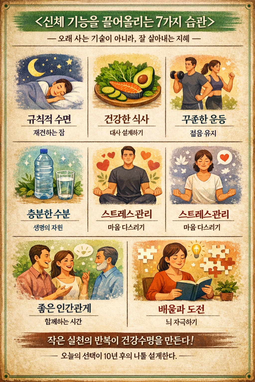 아래의 7가지 습관은 최신 의학 연구와 역학 자료, 그리고 인간 삶에 대한 철학적 통찰이 교차하는 지점에서 도출된, 가장 현실적이면서도 강력한 ‘몸 관리의 기본값’이다.