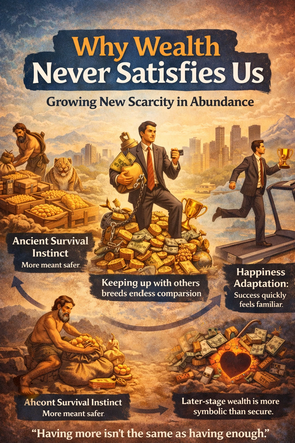 인류 역사에서 인간은 오랫동안 가난과 결핍 속에서 살아왔다. 먹을 것이 부족했고, 집은 불안정했으며, 삶은 늘 자연과 위험에 노출되어 있었다. 그런 시대에 부유함은 단순한 사치가 아니라 생존의 안전망이었다. 더 많은 곡식을 저장하고, 더 넓은 땅을 소유하며, 더 많은 재산을 축적하는 것은 곧 삶의 안정과 직결되었다. 그래서 인간의 마음속에는 아주 오래된 본능이 자리 잡았다.