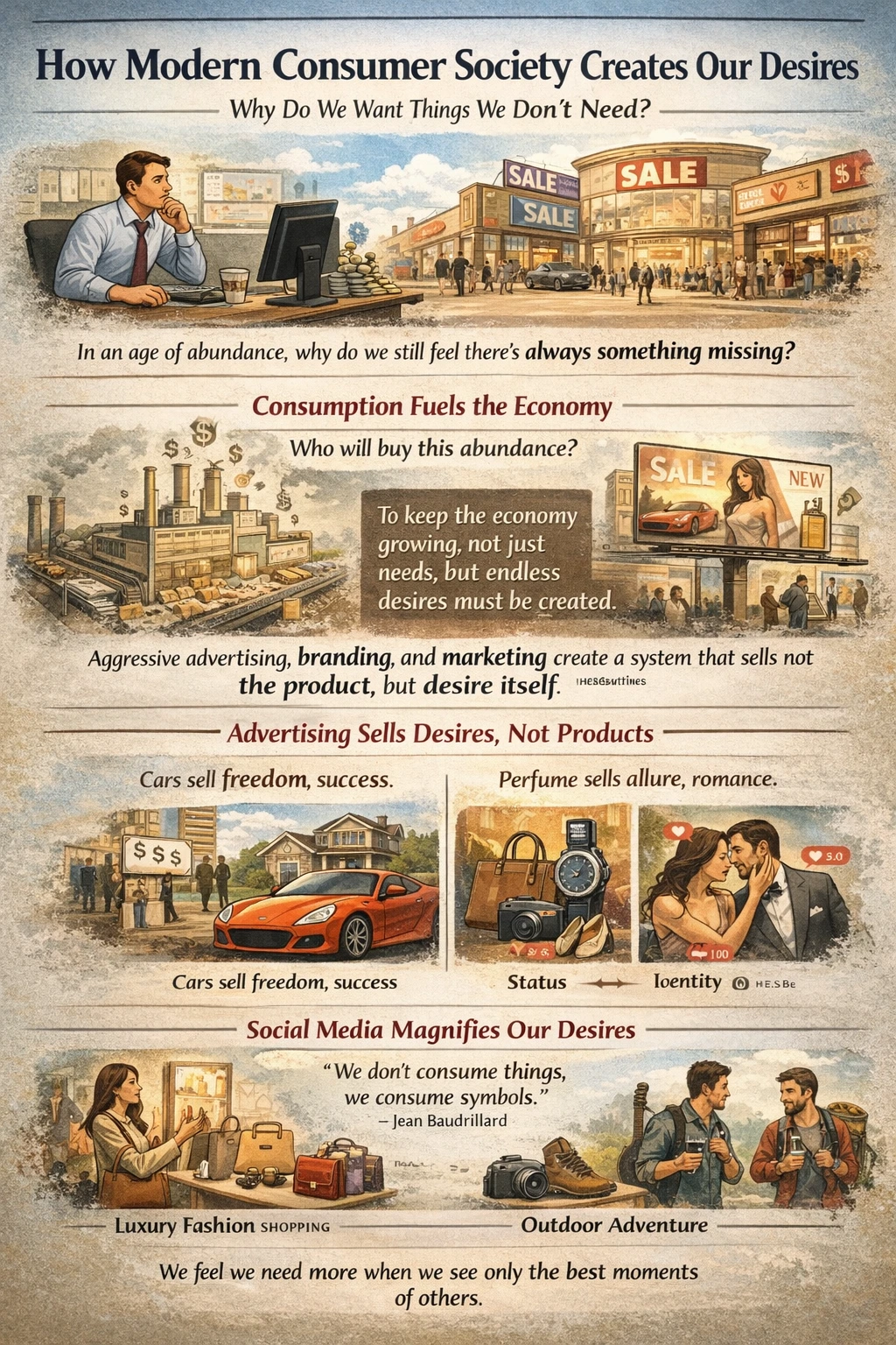 이 질문은 단순한 개인의 욕심만으로 설명되지는 않는다. 현대 사회는 인간의 욕망을 끊임없이 자극하고 확대하는 구조를 가지고 있기 때문이다. 우리가 살아가는 사회는 단순한 생산 사회가 아니라 소비 사회다.
