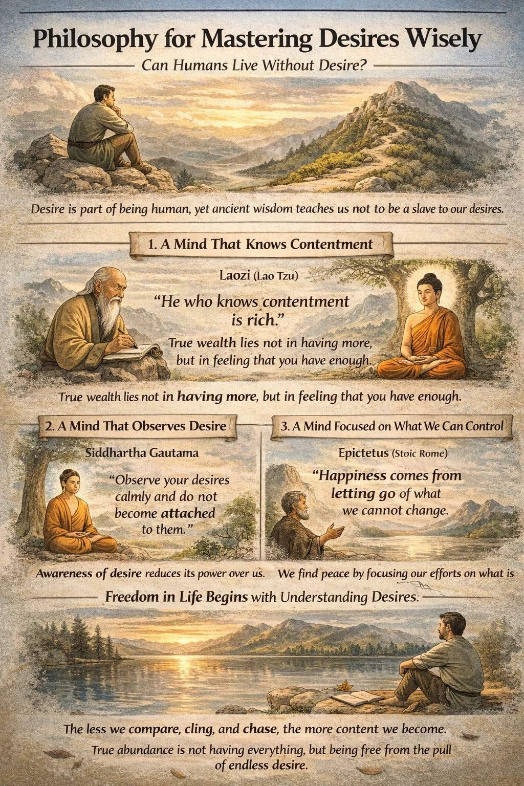 중국 고전 철학은 욕망을 다스리는 가장 중요한 덕목을 ‘지족(知足)’, 즉 충분함을 아는 마음이라고 보았다. 중국의 사상가 Laozi는 『도덕경』에서 이렇게 말했다.