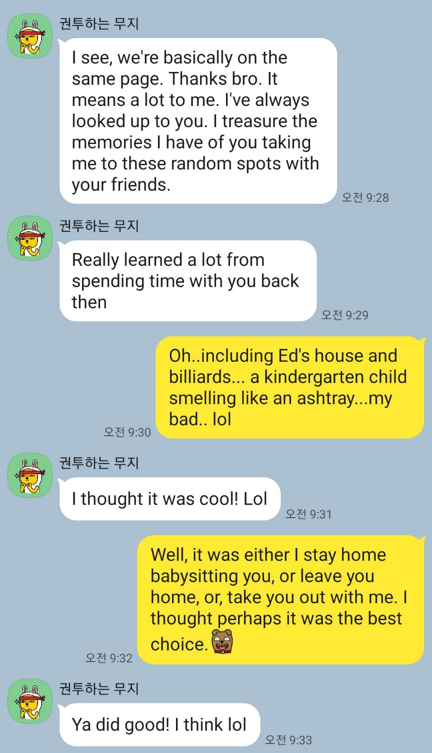 형과 친구들이 담배 연기를 뿜어대며 욕 섞인 대화를 하는 모습을 보이는 게 어린아이의 건강과 교육에 좋지 않은 영향을 줄 수 있다는 의식이 있었음에도, 집에 혼자 안 놔두고 다니는 게 어디냐며 나는 스스로 합리화했다.