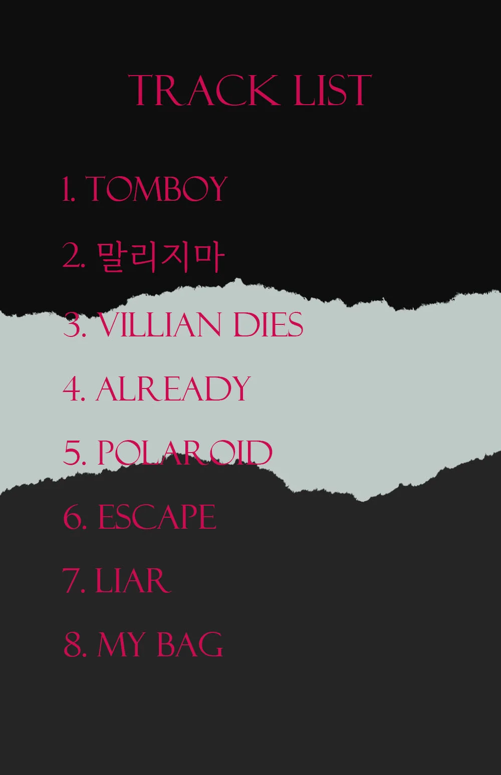 이후로 이어지는 수록곡들의 서사도 인상적이다. <말리지마>에서는 자신이 엉망이 됐음을 인정하며, 그렇지만 바보 같은 천사로 살지 않고 자기 마음대로 살겠다고 엄포를 놓는다. 민니의 몽환적인 도입부는 엉망인 모습을 더욱 깊게 묘사하고, 시원시원한 락 사운드와 미연의 보이스는 말릴 수 없는 자신을 넘치는 쾌감으로 전달한다. 이어지는 <Villian Dies>에서 그런 자신을 빌런, 즉 악당이라 볼 수 있지만 내가 죽지 않는다면 이 이야기의 주인공이니 당당하게 히로인이 되겠다는 의지를 피력한다. 아무리 죽지 않는 상대를 원망하고, 자신을 싫어하는 타인들을 보며 좌절한다. 이 소설 속 악당이 자신임을 자각한 이후로는 죽지 않고 살아남아 자신이 이 소설의 주인공이 되겠다고 주장한다. 다른 사람들에게 새드 엔딩이 되더라도, 우울한 마지막 장을 쓰더라도, 자신의 해피엔딩을 쓰겠다고 다짐한다. 주인공과 악당의 입장을 뒤집어서 보는 간단한 생각으로 꽤나 재밌고 소름 돋는 설정을 뽑아냈다.