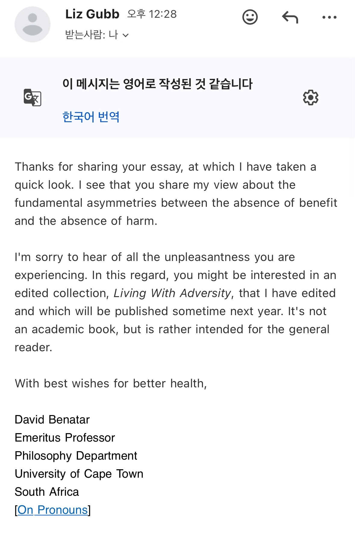 내가 쓴 쾌락의 불평등 글에 대해서 어떻게 생각하시는지 여쭈어봤는데 이렇게 메일 답장이 왔다.